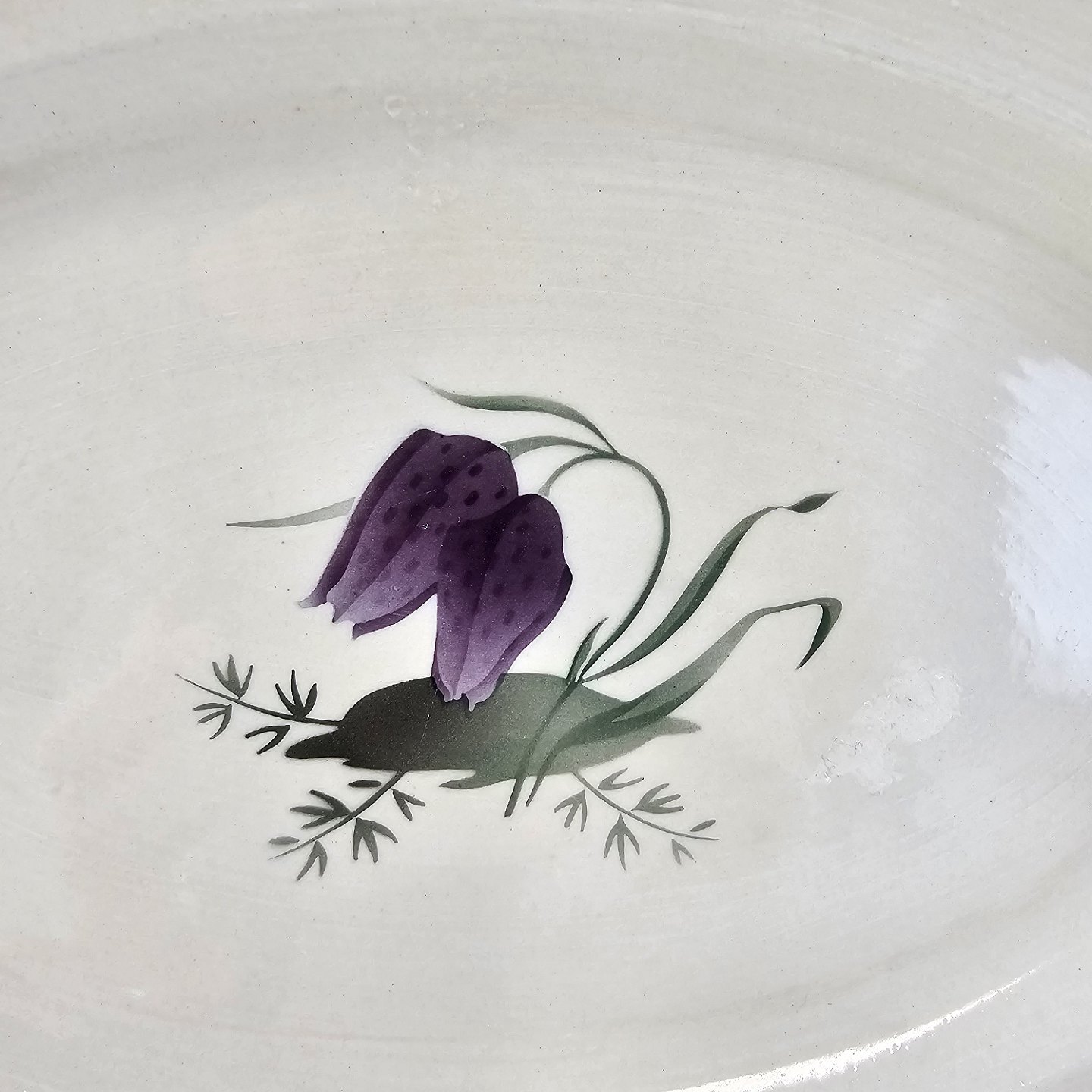 Fajancestel i stelform Viktoria II (Fletværk) med flettet kant og dekoration af en vibeæg blomst i violet og grøn, fremstillet i perioden 1934-1967