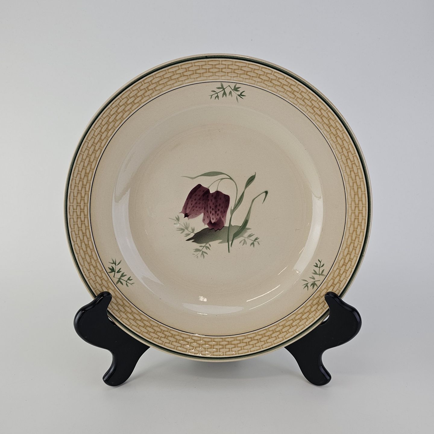 Fajancestel i stelform Viktoria II (Fletværk) med flettet kant og dekoration af en vibeæg blomst i violet og grøn, fremstillet i perioden 1934-1967