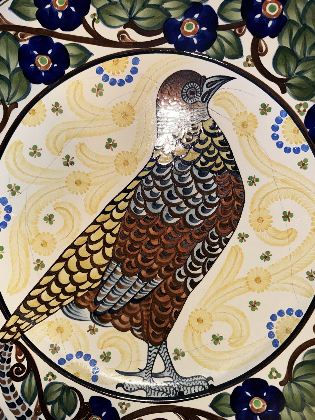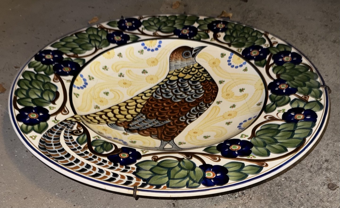 Stort fajancefad fra Aluminia, dekoreret af Christian Joachim med et motiv af en guldfasan omgivet af blomster og blade. Fabriksmærket på bagsiden. Som det fremgår af fotos er der flere revner efter skade på fadet. Mål: Ø. 45,5 cm FORSENDELSE IKKE MULIG - SKAL AFHENTES PÅ FREDERIKSBERG