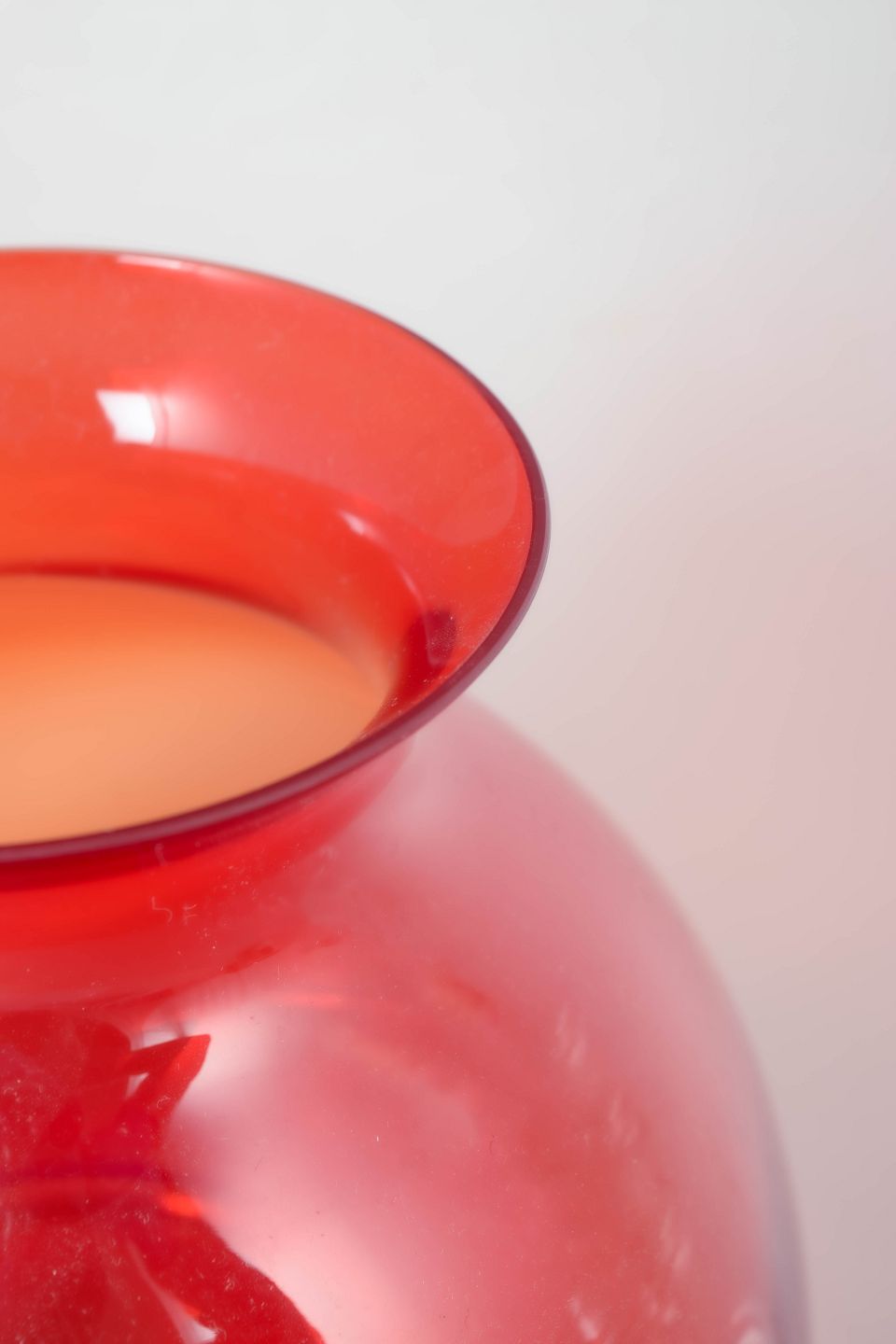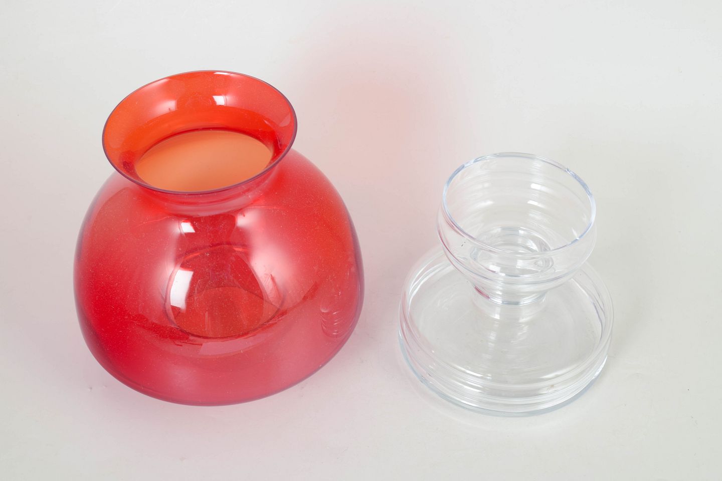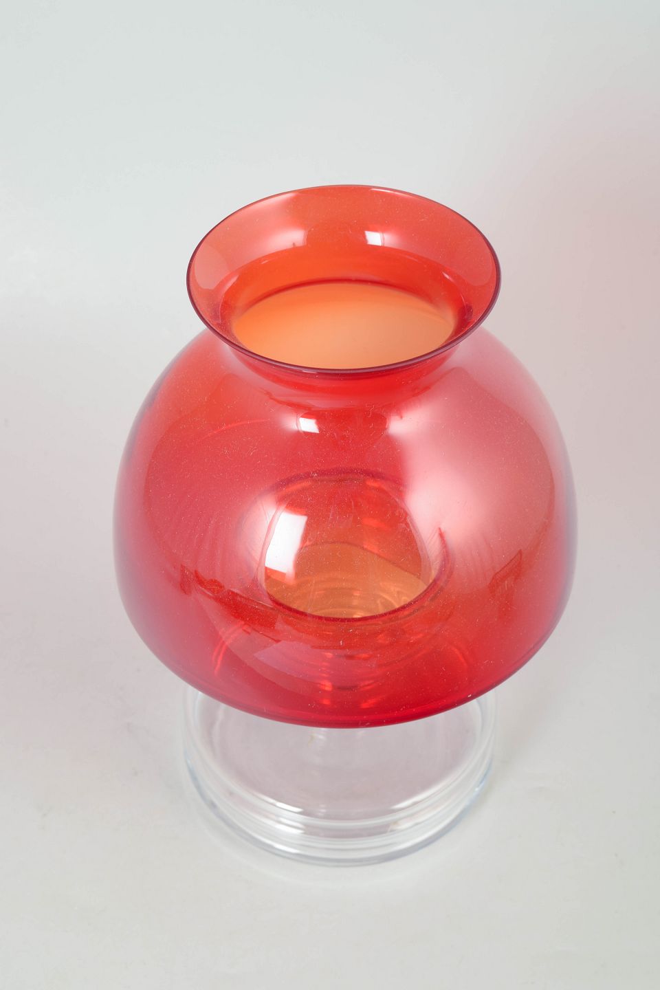 Dekorativ fyrfadsstage i glas med klar fod og stor rød skærm, model Apollo, designet af Nanny Still. Elegant og skulpturel form typisk for finsk glasdesign fra perioden.