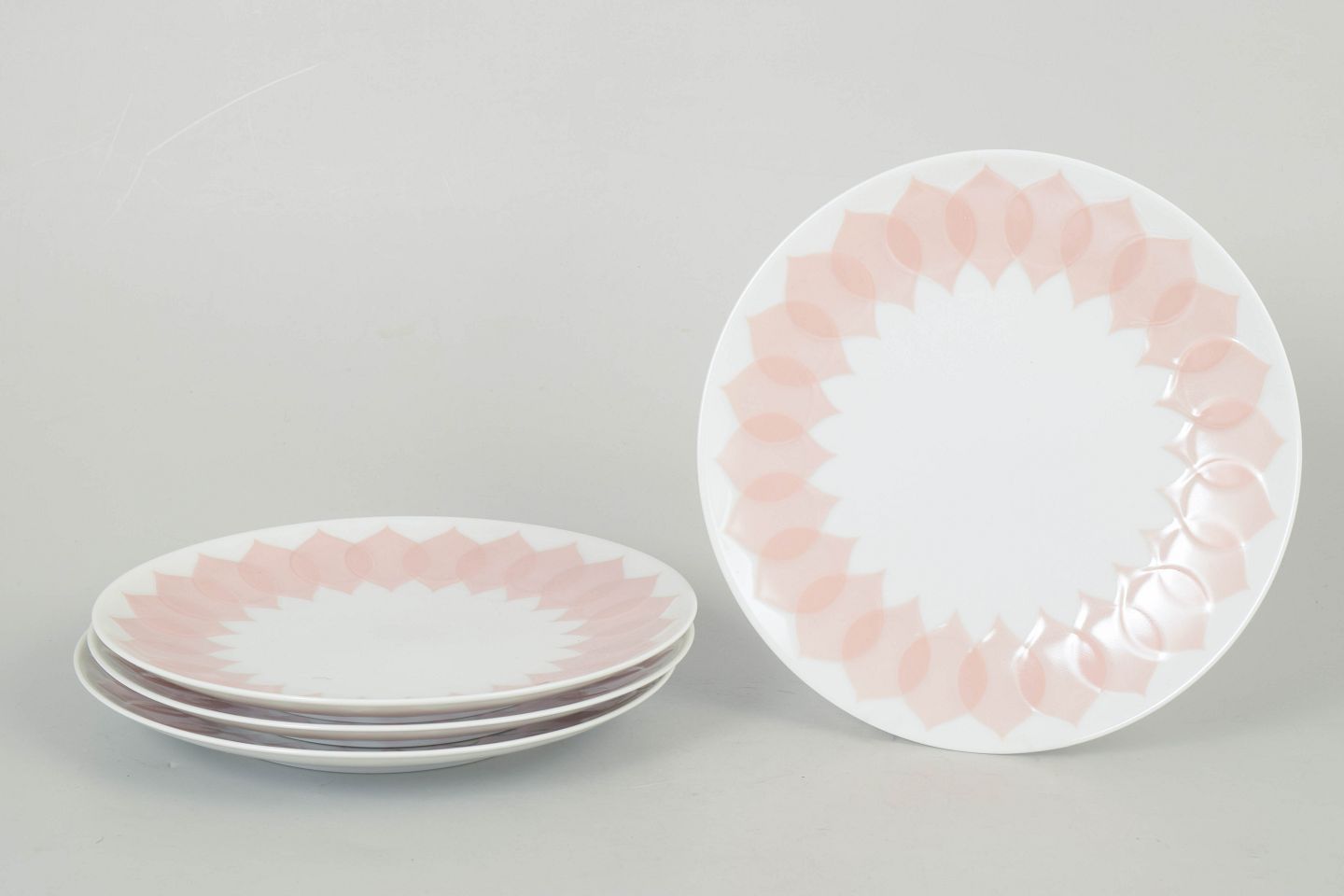 Fire tallerkener i porcelæn med rosa “Lotus” dekoration, udført med gentaget bladmotiv langs kanten i bløde nuancer og et karakteristisk dekorativt udtryk.