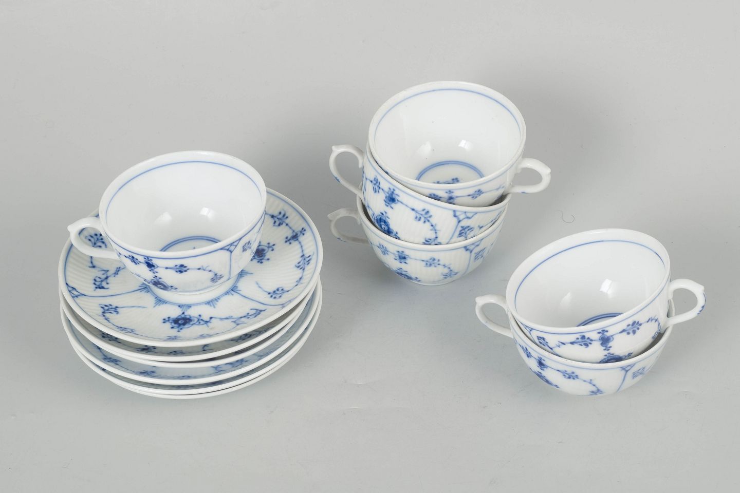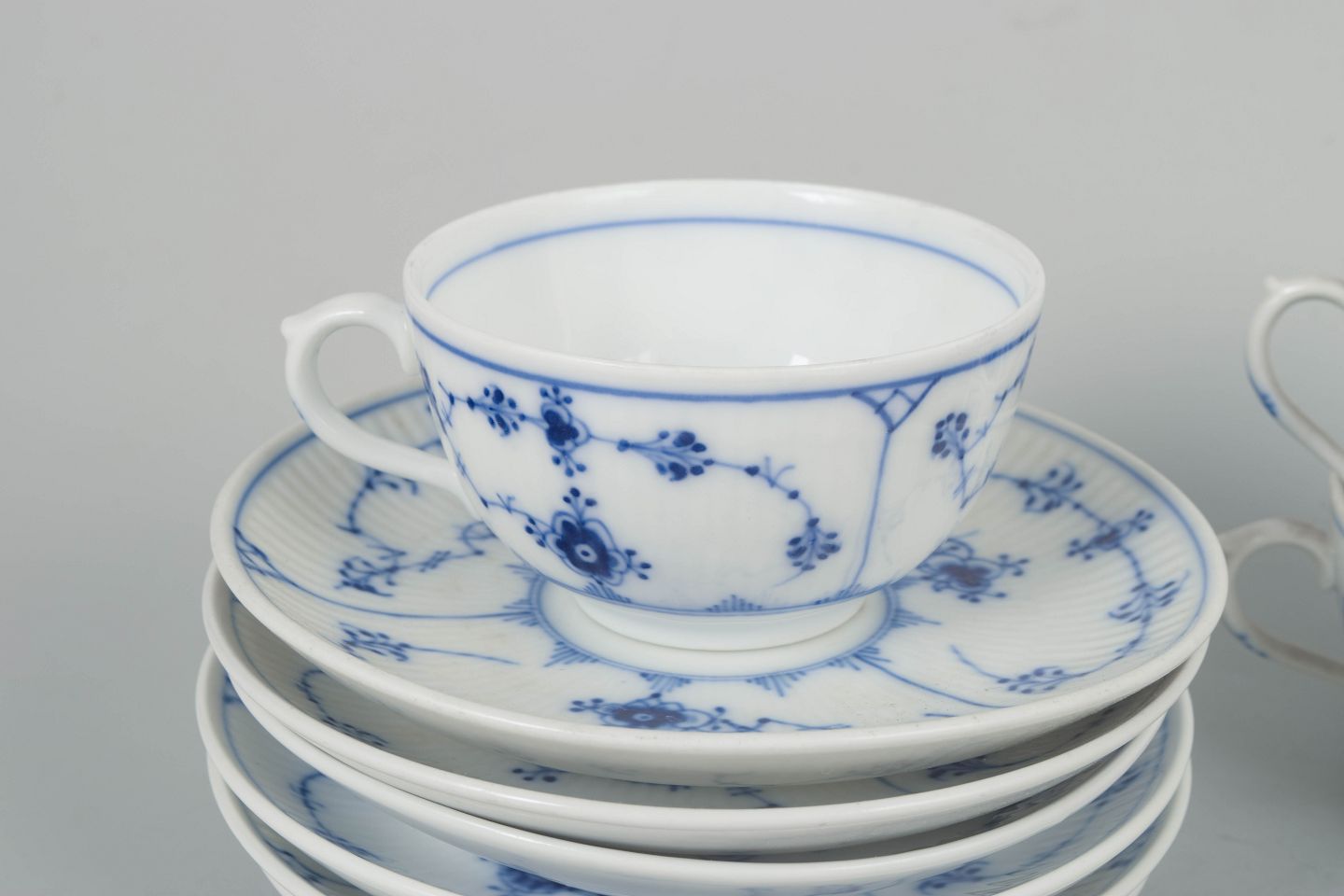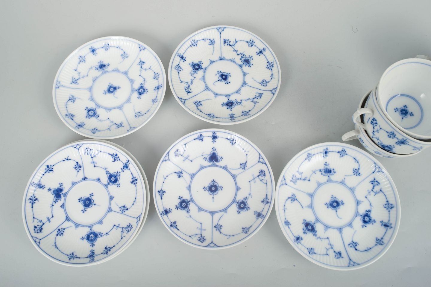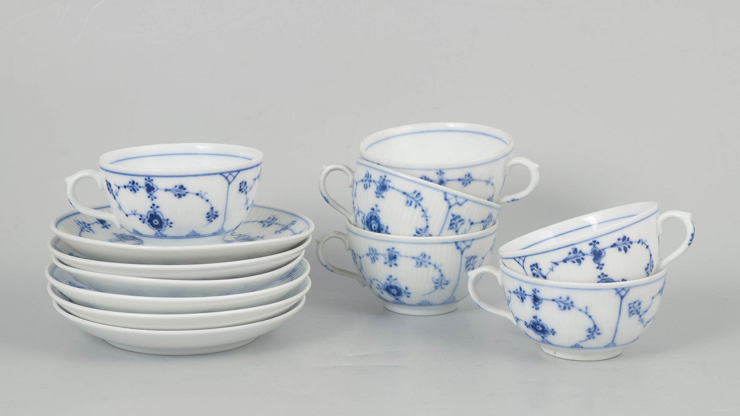 Royal Copenhagen Musselmalet Riflet, sæt af seks kaffekopper med underkopper.