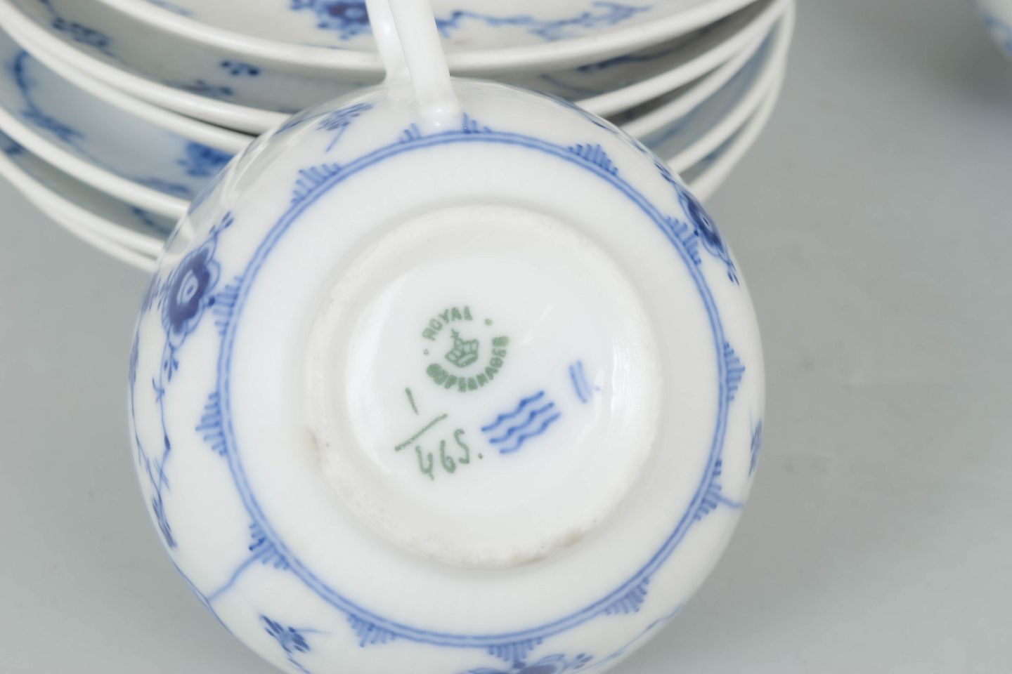 Klassisk sæt af seks kaffekopper med matchende underkopper i Royal Copenhagens Musselmalet Riflet stel, model 1/465, udført i håndmalet porcelæn med det ikoniske blå dekorerede mønster. Sættet omfatter både 1. sortering og 2. sortering og spænder fra tidligt 20. århundrede til 1980’erne.