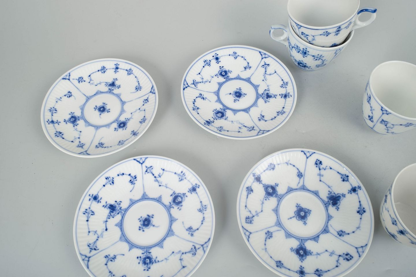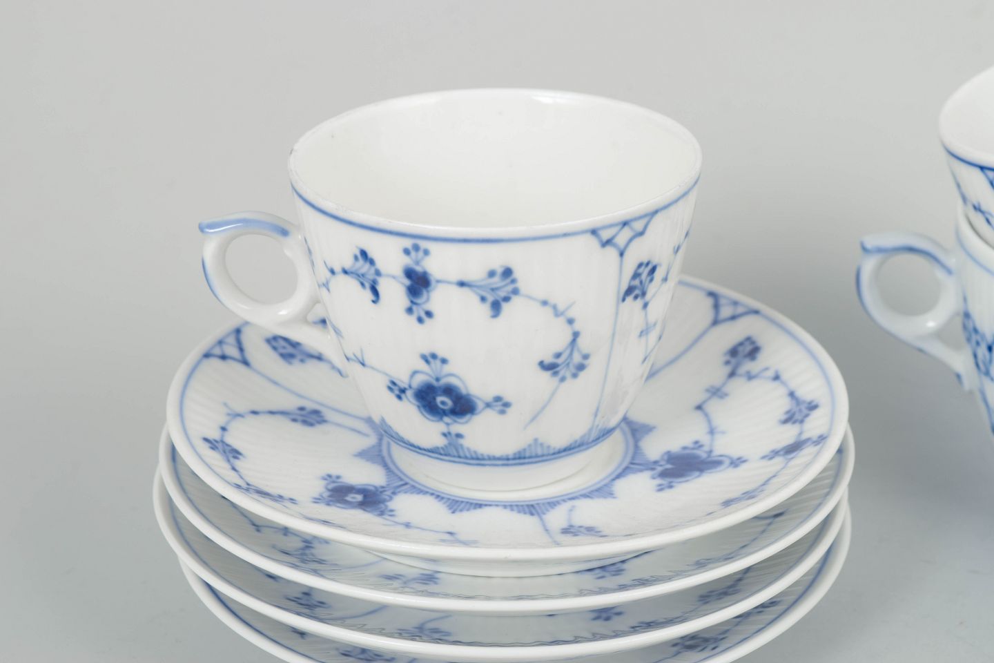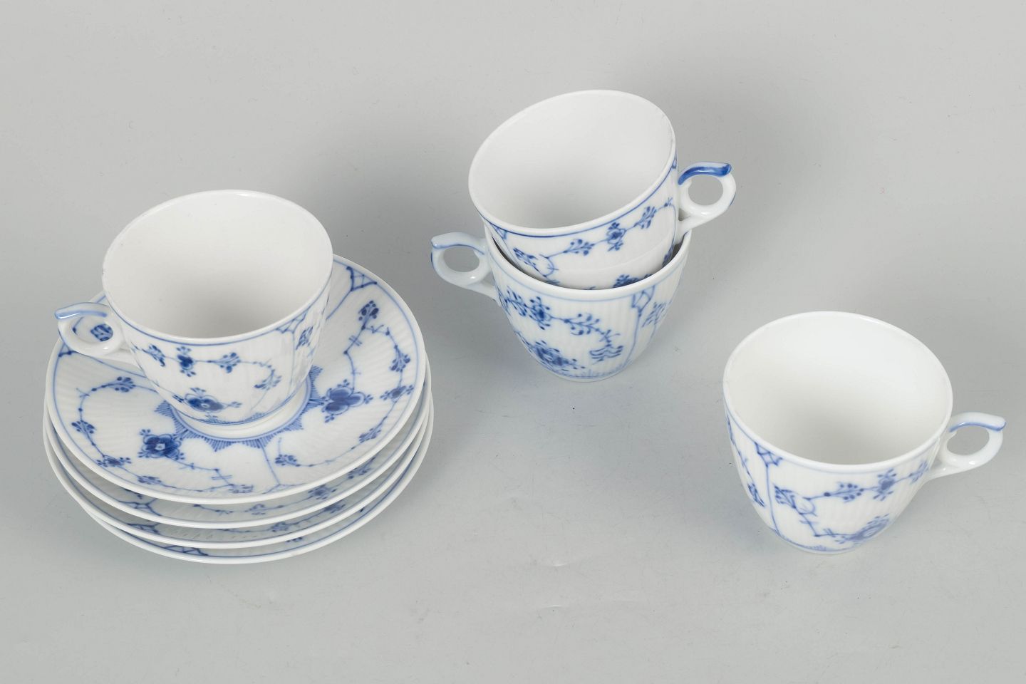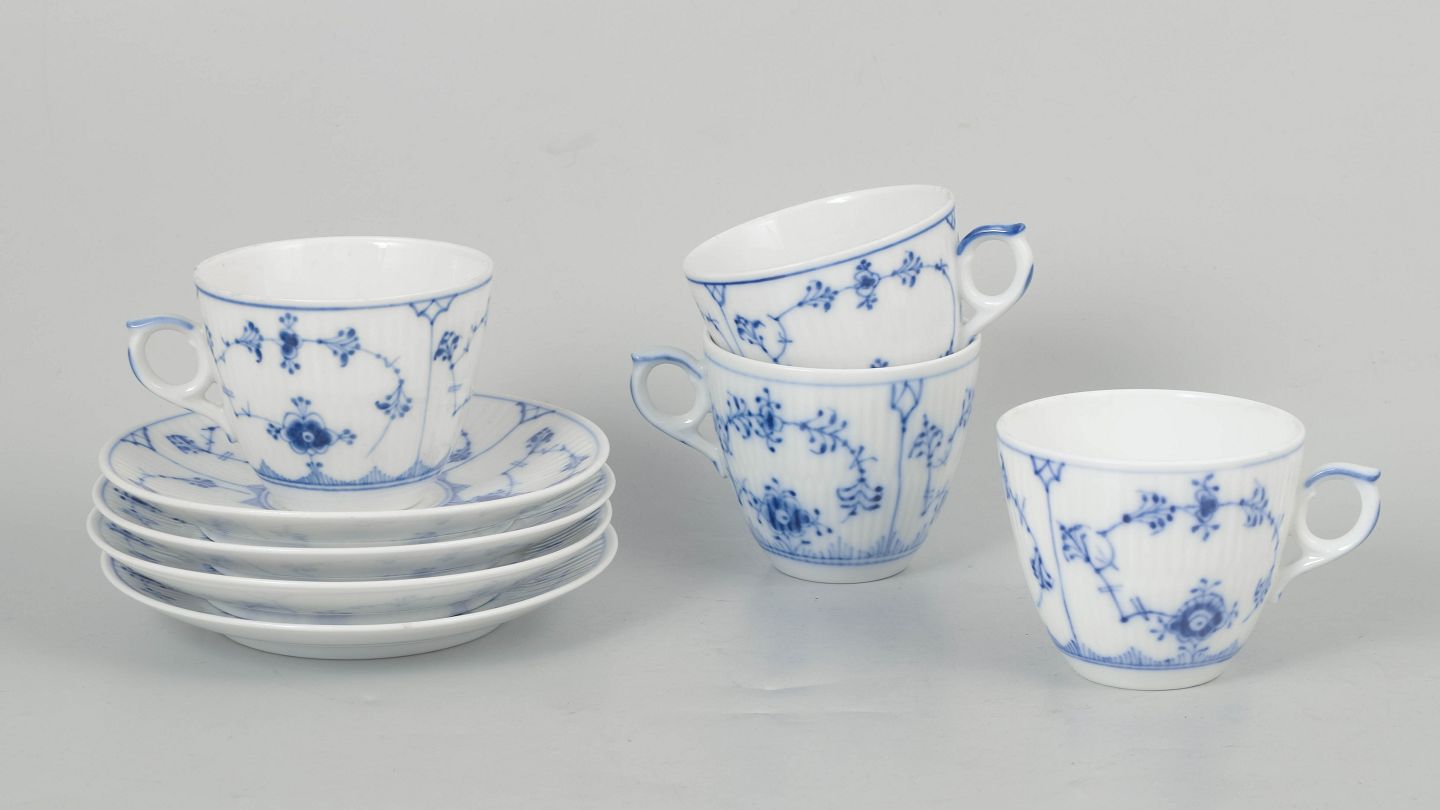 Royal Copenhagen Musselmalet Riflet, sæt af fire kaffekopper med underkopper.
