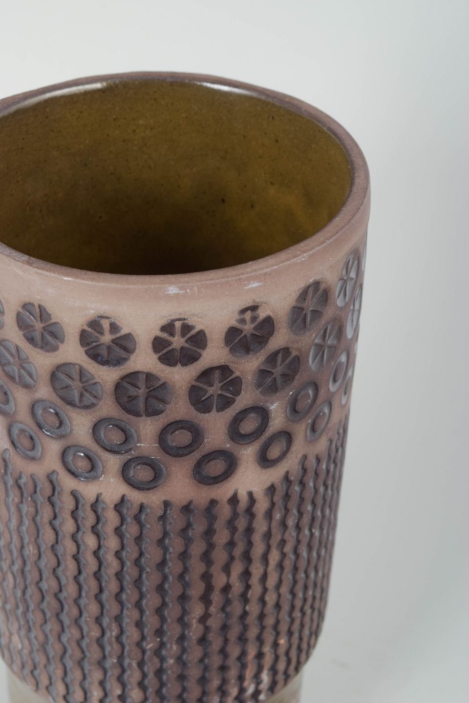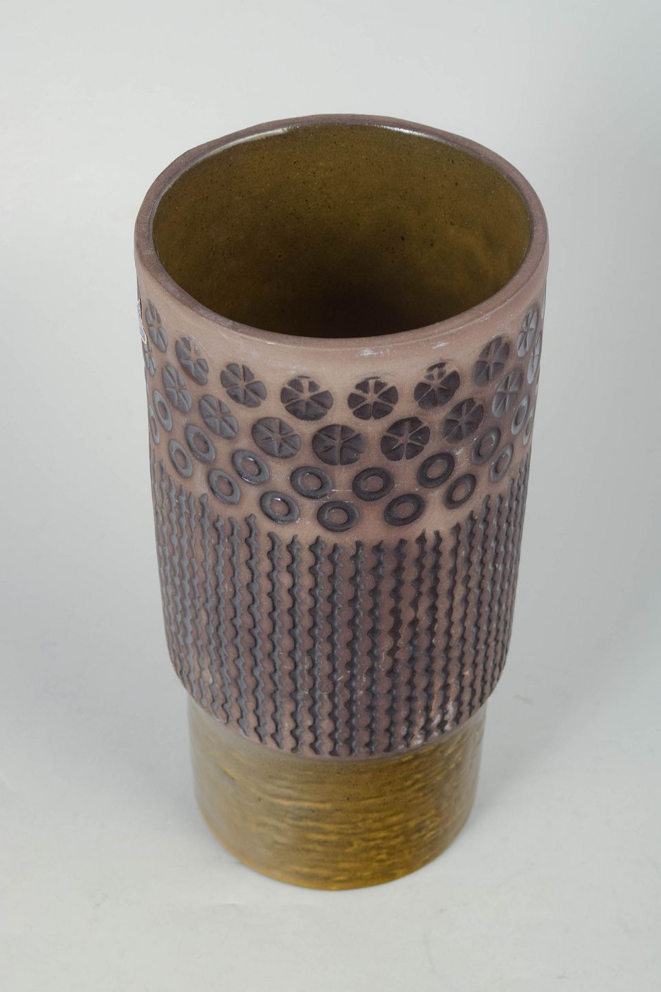 Høj cylindrisk keramikvase model 6074M med reliefdekoreret overflade i geometriske mønstre og håndglaserede nuancer i rosa, grå og olivengrøn.