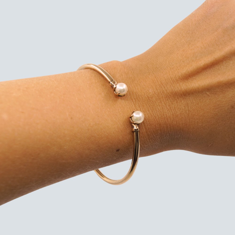 Bernhard Hertz; Armring af 8 kt. guld. Prydet med to perler. Indvendige mål: 6,1 cm x 5,1 cm. Stemplet "BH BH". Kontakt os gerne, hvis du søger noget specifikt. Hvad du ser på vores hjemmeside, er blot et udvalg af det, som vi har.