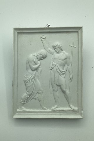 Royal Copenhagen Bisque Plate Baptisment of Christ No 113. Copy by O.H.B. Olrik from 1848 after Thorvaldsens original from Rom 1805-07. Measures 12 x 16cm . (4.72 x 6.29 inch) Three chip: Top middle. Bottom right. On the backside.