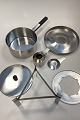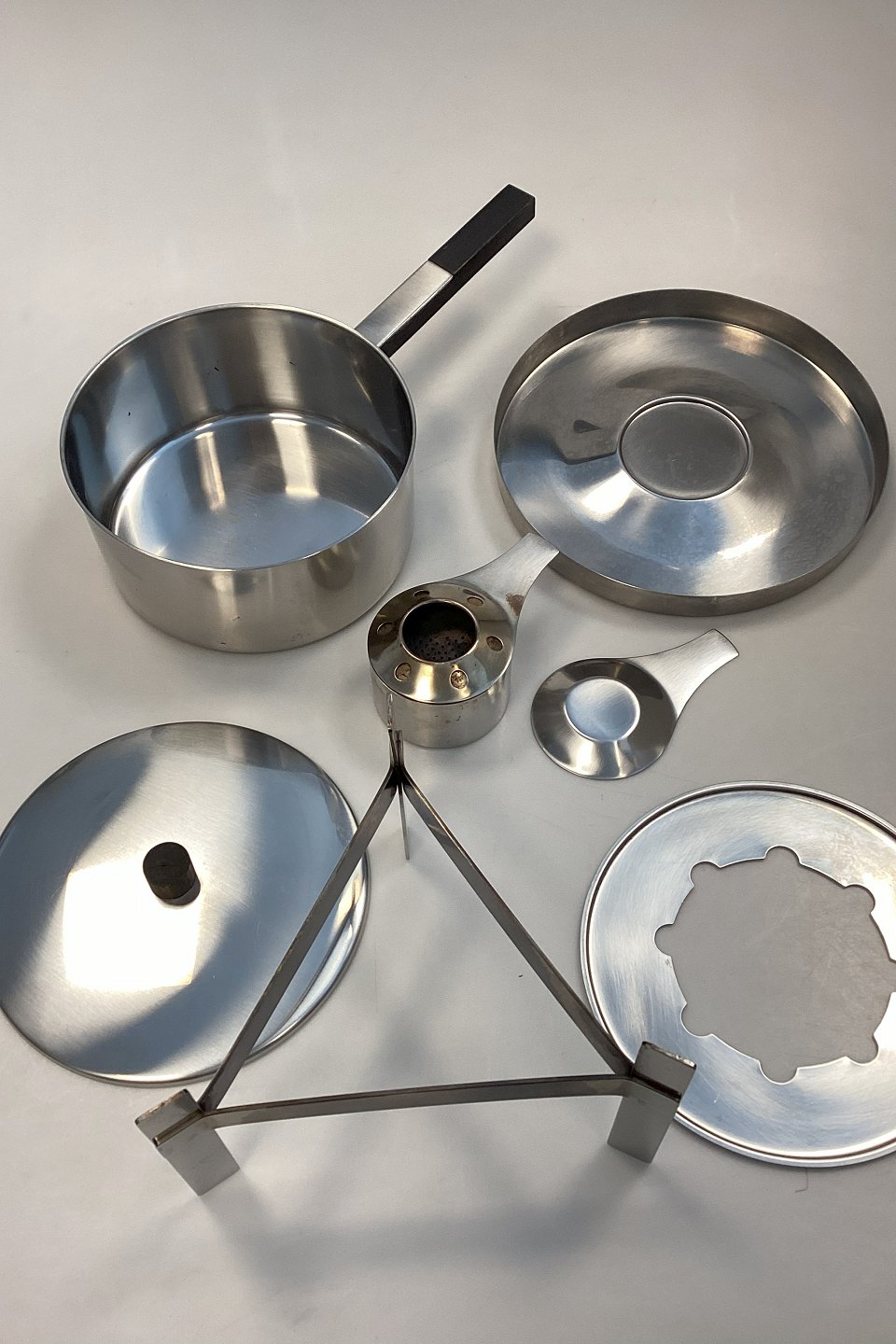 Komplet sæt med gryde, holder, brænder og bundfad. Tydelige brugstegn, men i god stand.