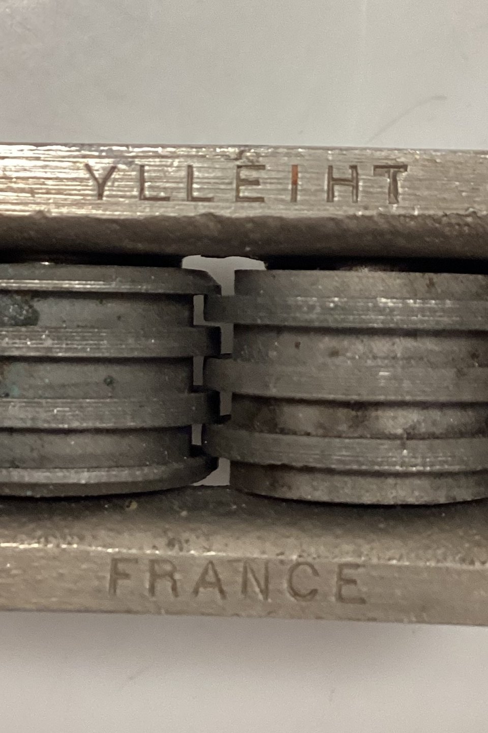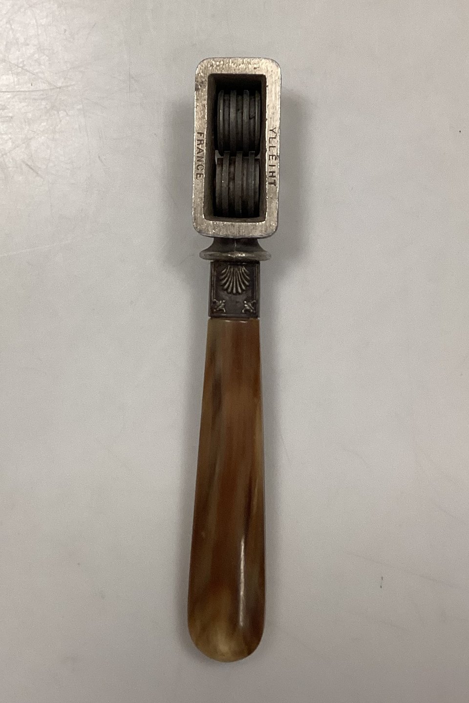 Tilquin-Anvers Rustfri Knivsliber med lyst/brunt bakelit/plasthåndtag og muslinge motiv. I god stand.