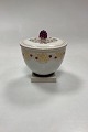 Bing og Grøndahl Hans Tegner Bonbonniere med druer. Hvid med drueranker i guld og lilla druer i overglasur. Signeret HT/Hans Tegner, LL/Lotte Lindahl og EK/Emma Kongsbøll.