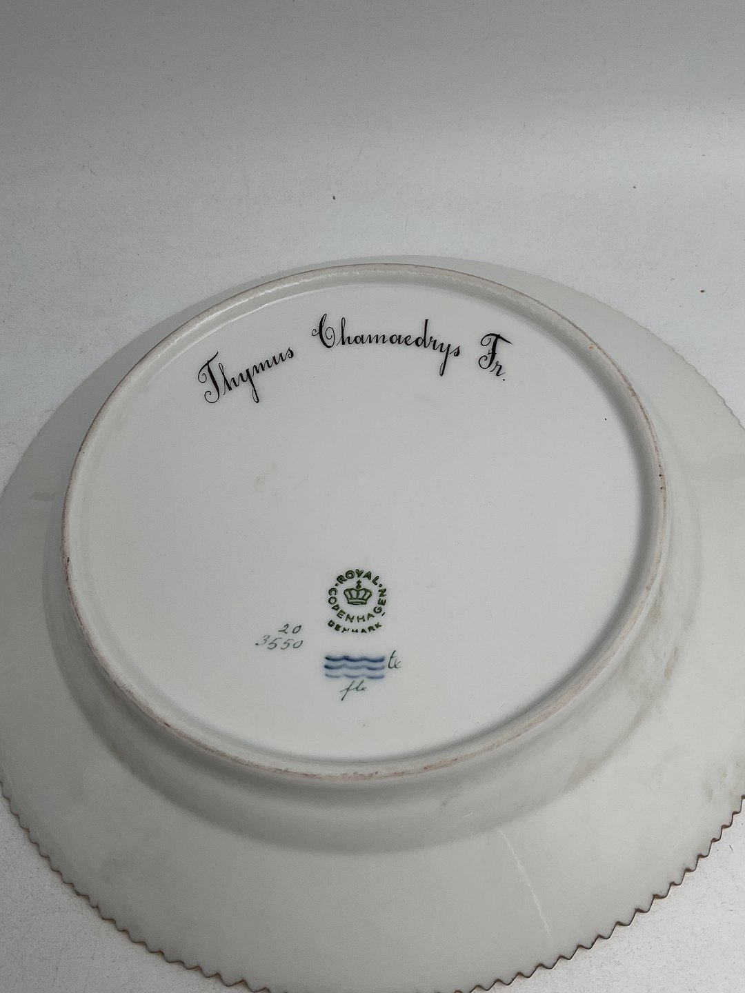 Royal Copenhagen Flora Danica Frokosttallerken No. 20/3550 Måler 22 cm. (8.66 inch) 1. Sortering. Latinsk navn: Thymus Chamaedrys Fr