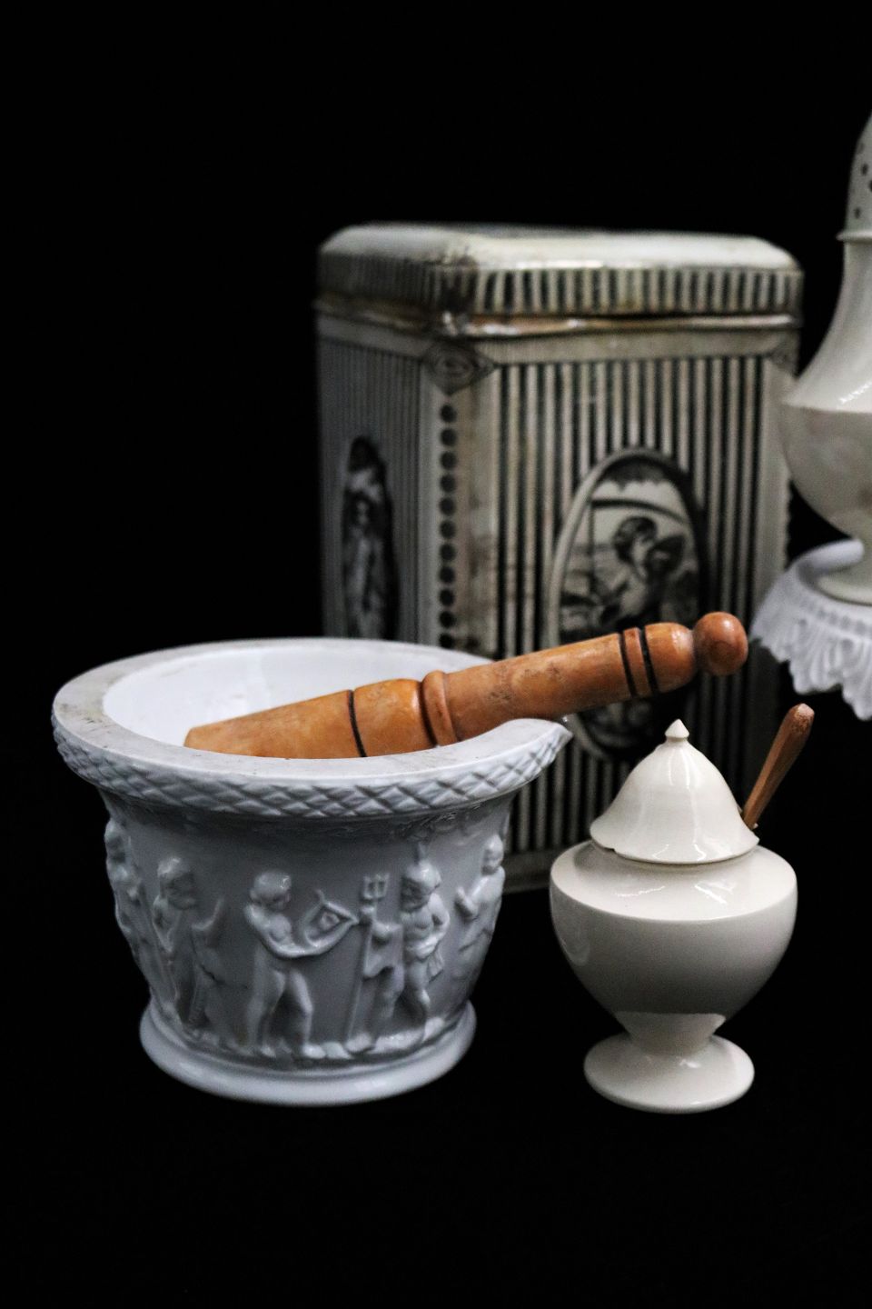 Decorative old Swedish mortar in white porcelain / wood with fine decorations...