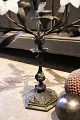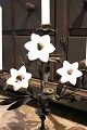 Antique, French candlestick in dark patinated bronze, for 4 candles and decorated with 3 old white glass flowers. H: 42cm. W: 32cm.