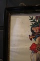 Dekorativt , gammelt billede med motiv af julemanden der deler gaver ud til børnene indrammet i gammel sort træramme med en fin patina.