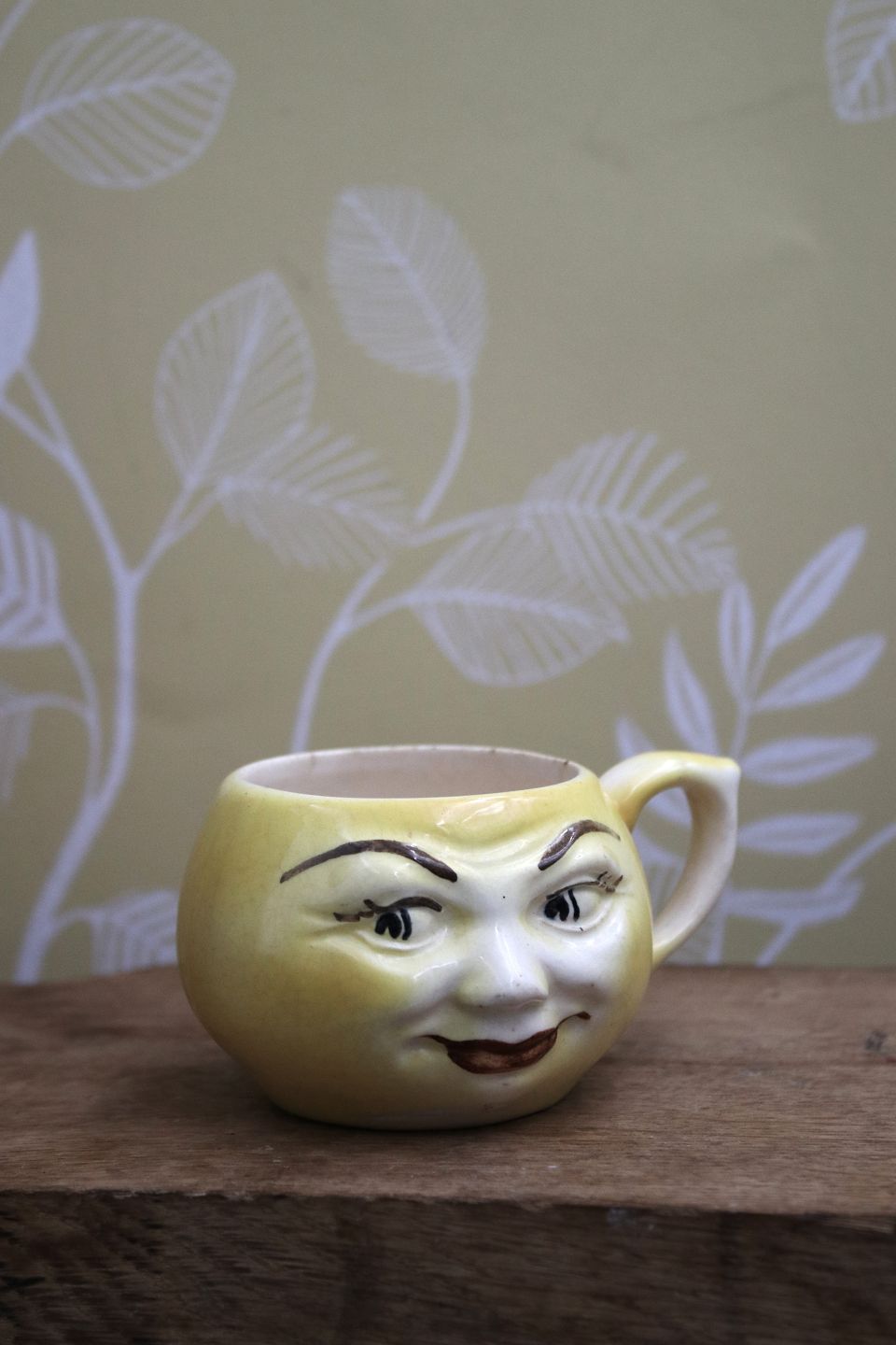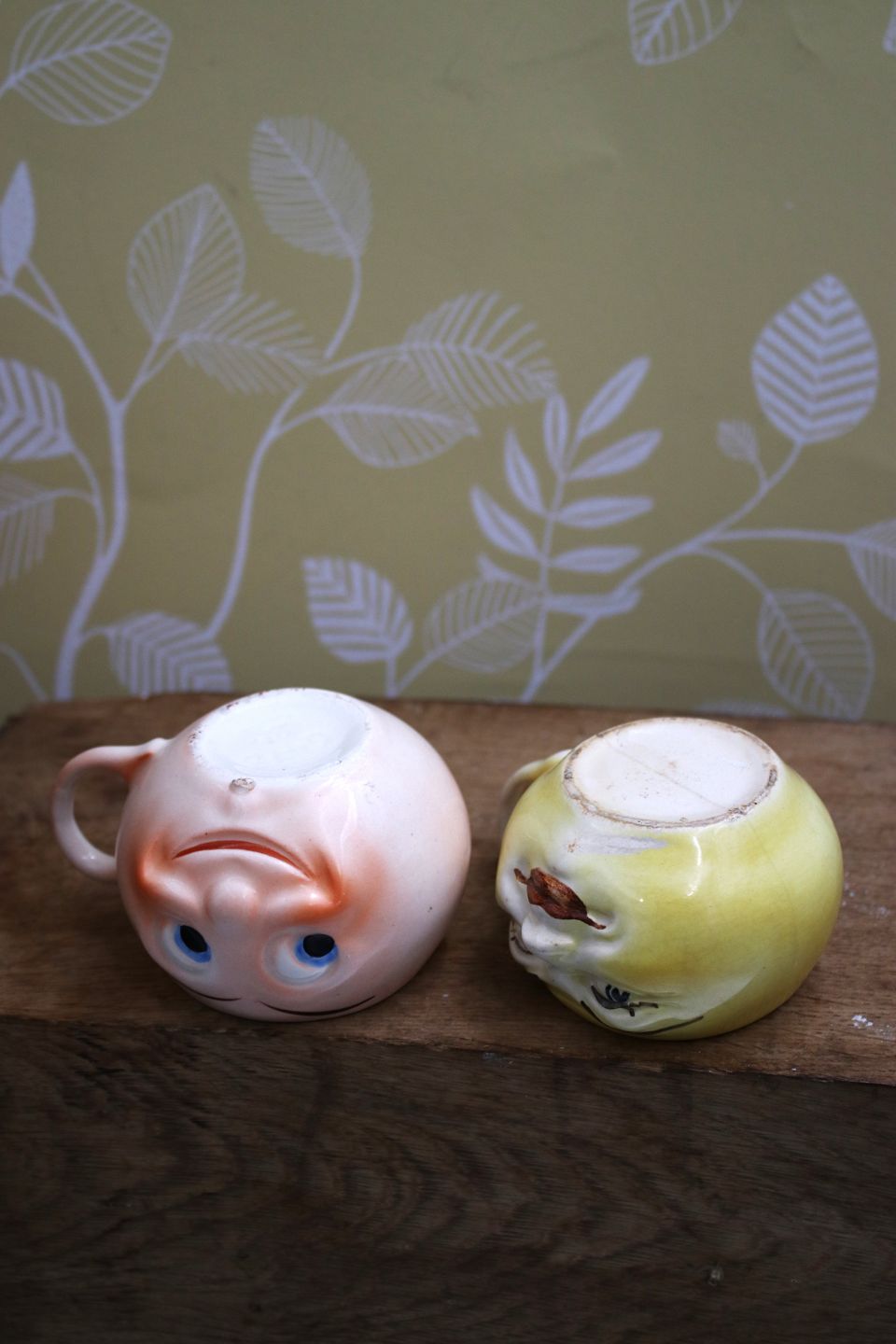Gamle børnekopper i fajance med sjove ansigter. H: 5,5cm. Dia.: 7,5cm. (1 i gul farve og 1 i lyserød farve haves på lager)