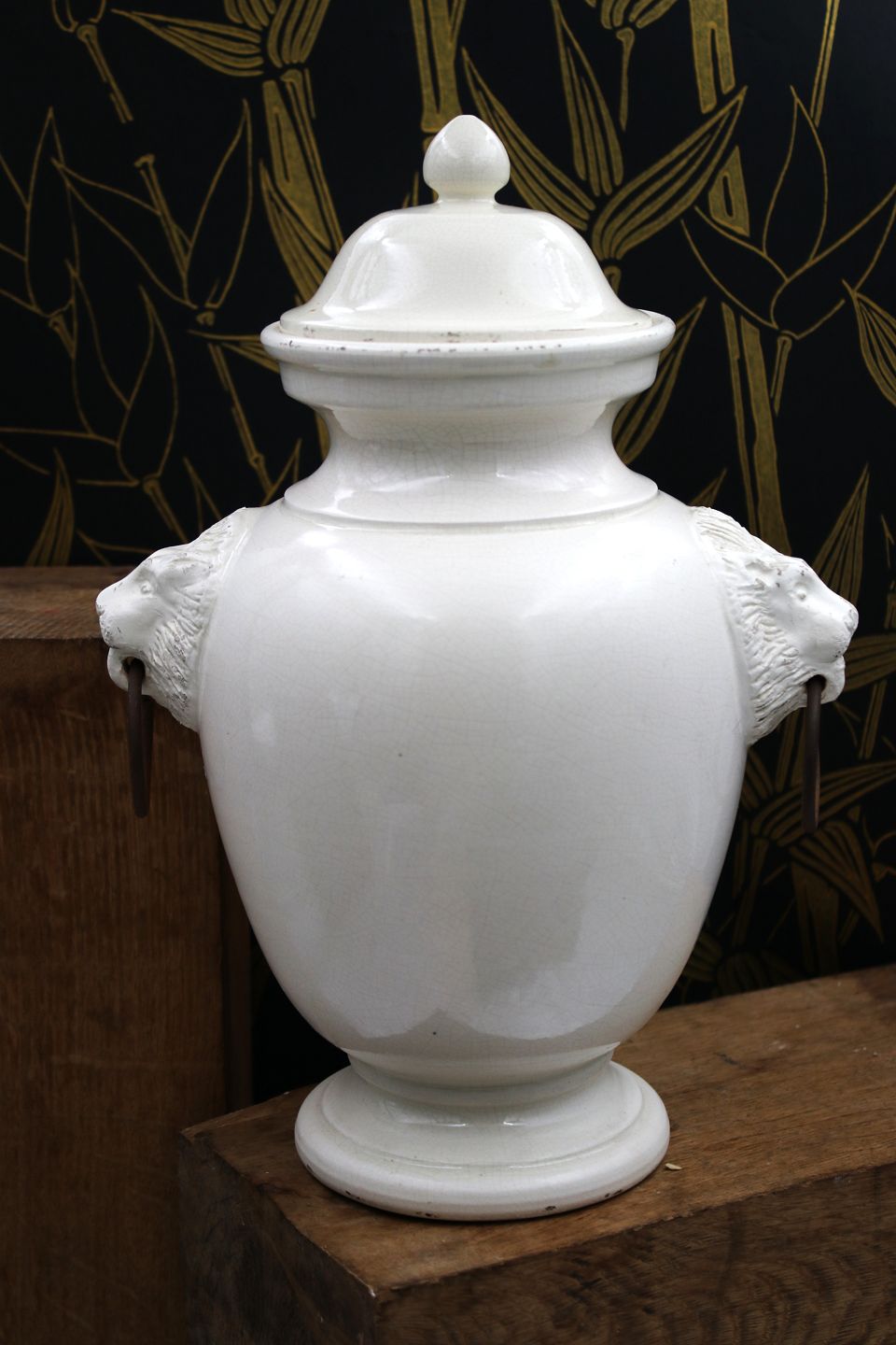 Gammel glaseret stentøjs lågkrukke med løvehoveder på siden. Krukken har en fin gammel patina og måler : H: 32cm.