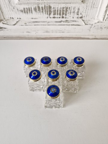 Sæt på 8 saltbøsser i krystal med låg i forgyldt sølv og emalje