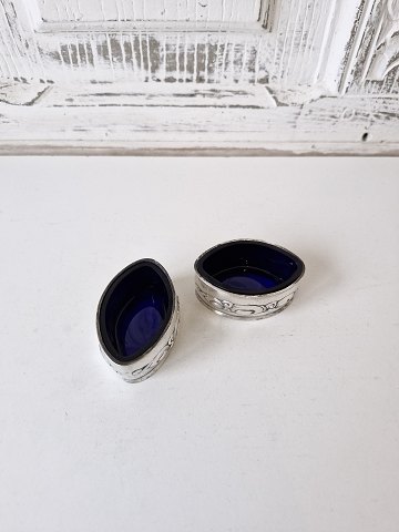 Pair of oval salt owls in silver with decoration in the art nouveau style with blue glass inserts. Stamped the three towers 1909. Dimensions 4 x 6 cm. Height 3 cm.
