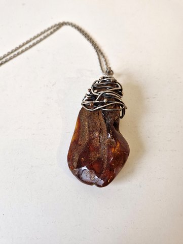 Silver necklace with large amber pendant wrapped with silver thread. Stamped 925. Dimensions of the amber lump 4 x 8 cm. Length of the necklace 60 cm. Width 2 mm.