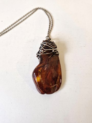 Sølv halskæde med stort ravvedhæng omviklet med sølv tråd Stemplet 925 Mål på ravklumpen 4 x 8 cm. Længde på halskæden 60 cm. Bredde 2 mm.