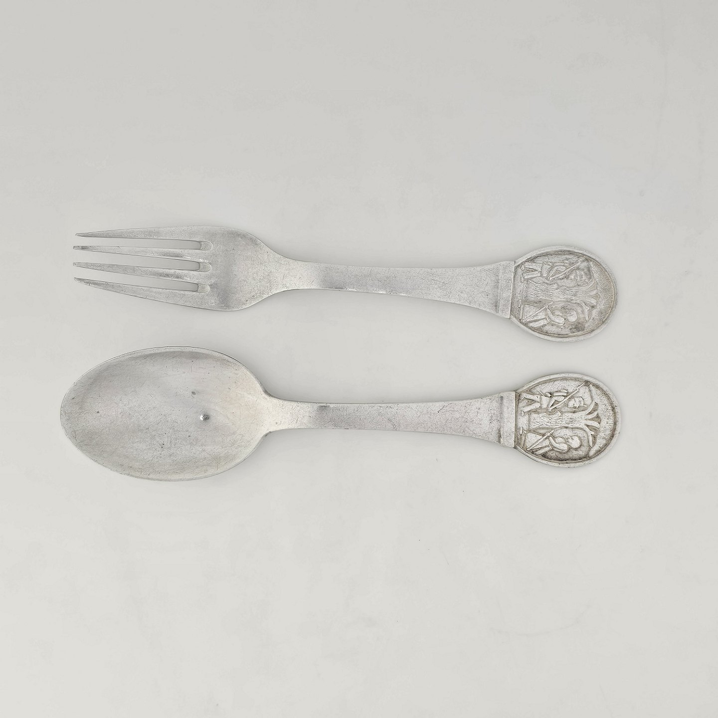 Gaffel og ske af pletsølv med motiv af H.C. Andersens Fyrtøjet