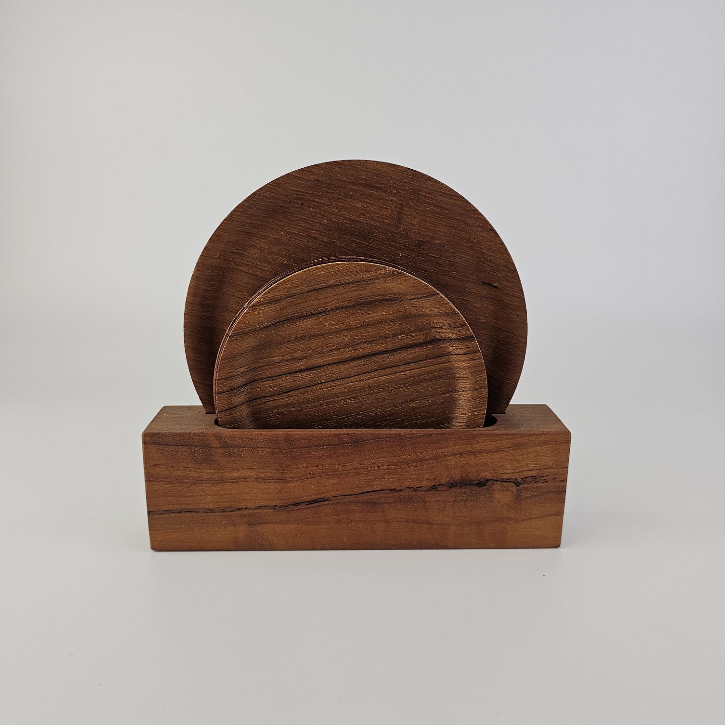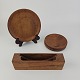 Bordskånere af teaktræ i to forskellige størrelser til kopper og en kande. Holder inkluderet.