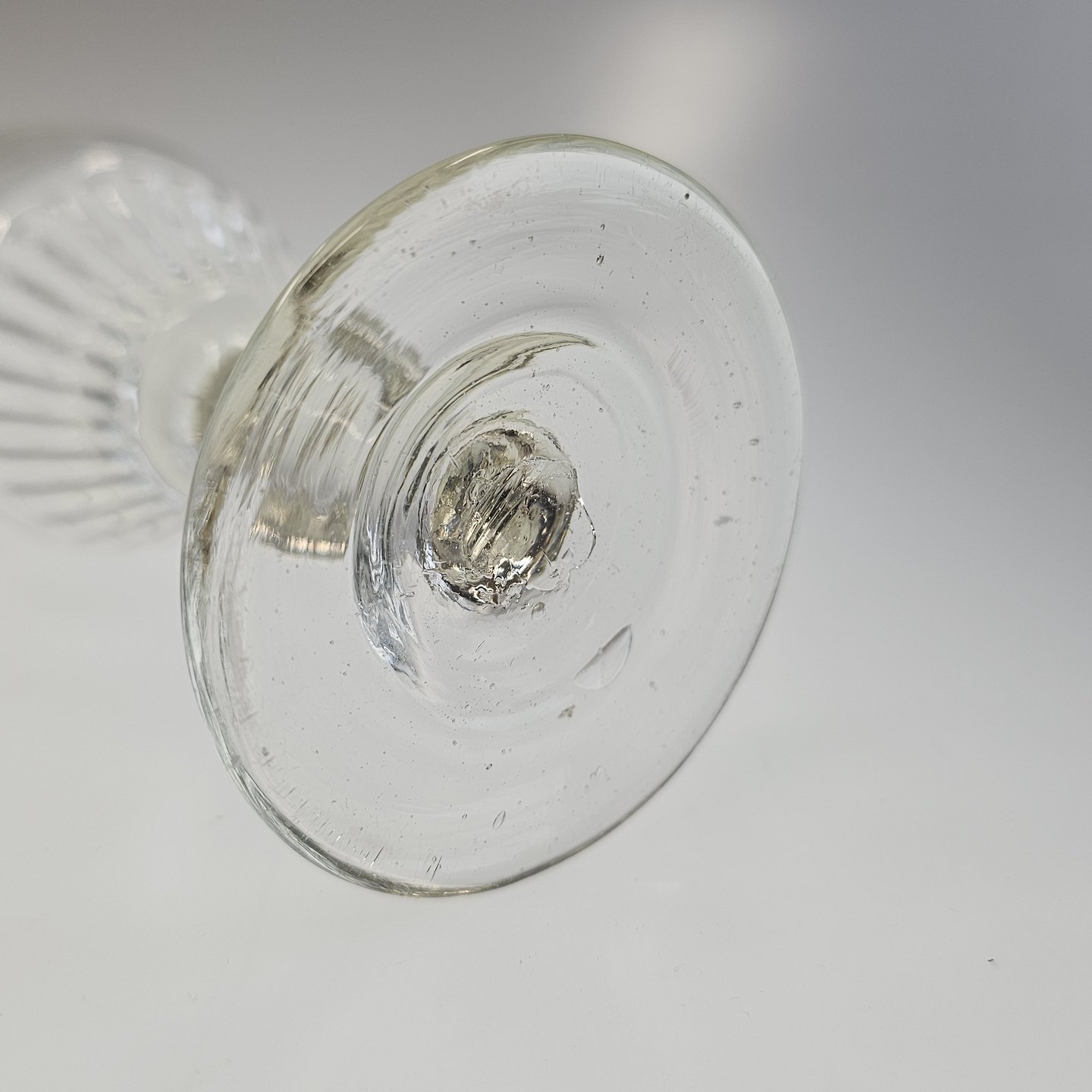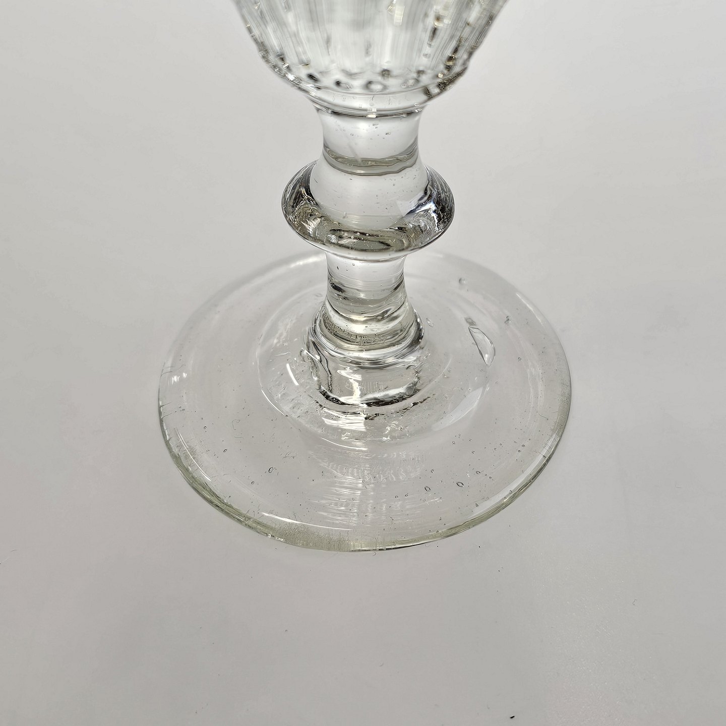 Håndblæst vinglas med riflet, tøndeformet kumme på stilk med knap