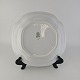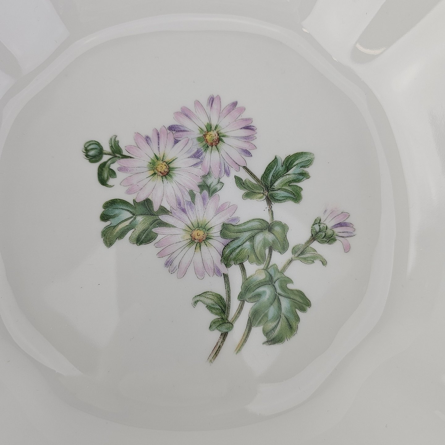 Krysantemum er hvidt porcelæn dekoreret med lys lilla blomst, grønne blade og guldkant.