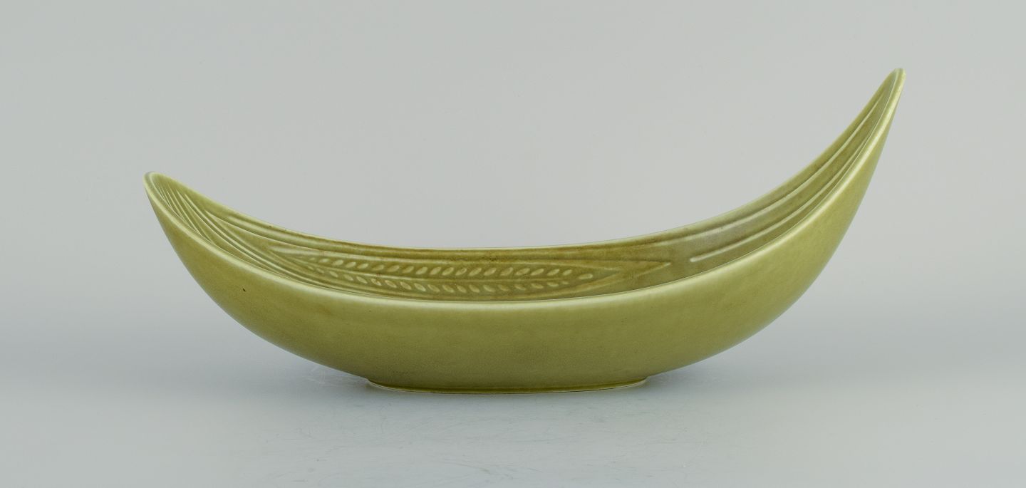 Gunnar Nylund (1904–1997) for Rörstrand. Rialto bowl in ceramic, oblong organic shape with light green glaze.