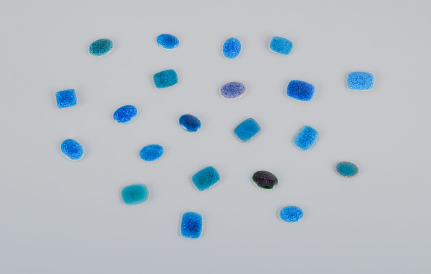 Twenty unique brooches in glazed stoneware in blue and turquoise shades.