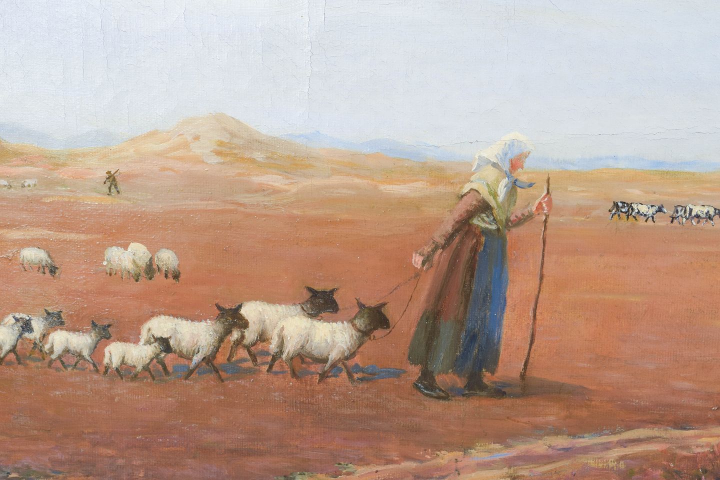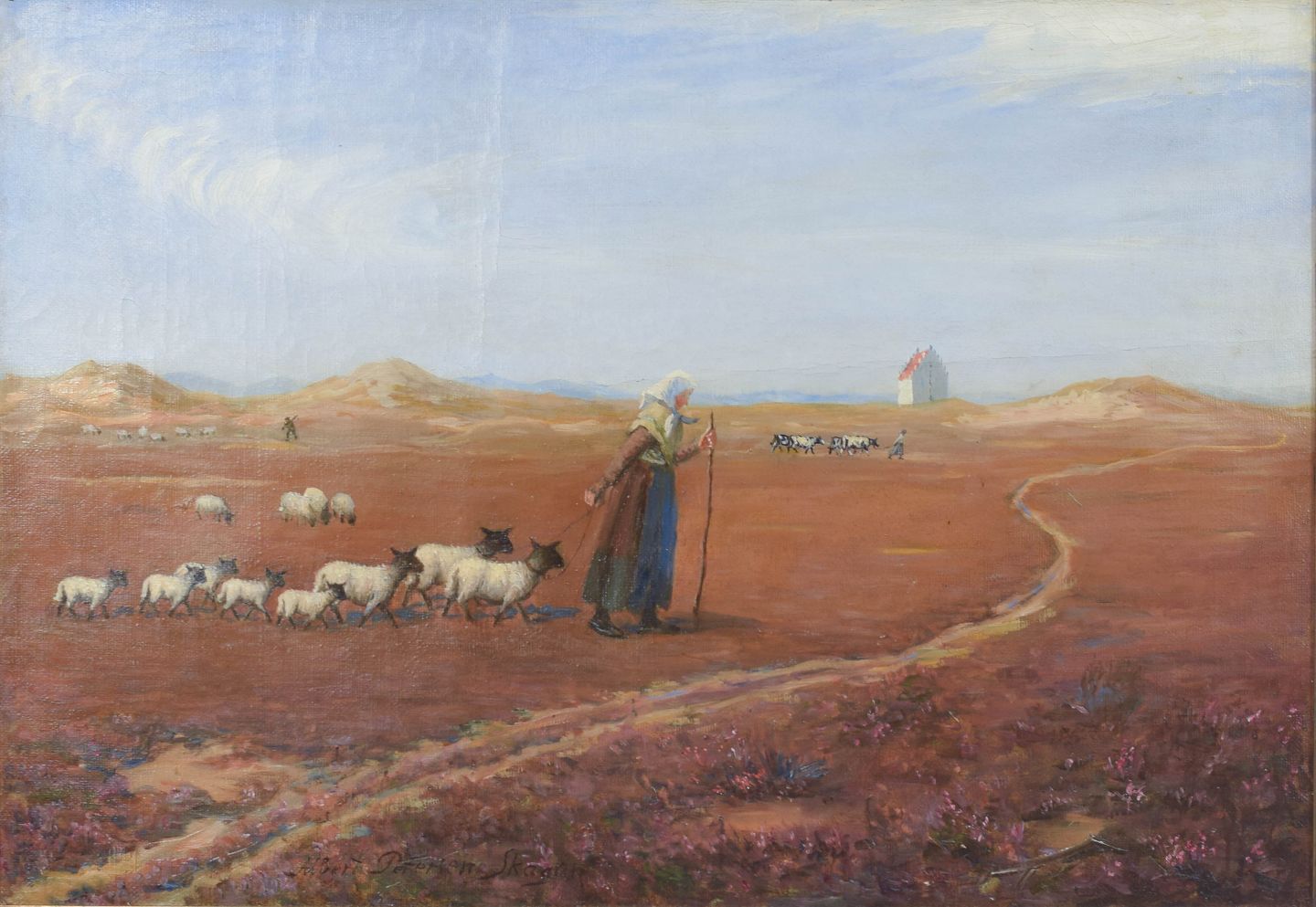 Naturalistic landscape scene depicting a shepherd with a flock of sheep in open terrain, rendered in a calm and atmospheric palette. The composition reflects rural life around the turn of the century, with emphasis on light, space, and narrative. Signed.