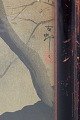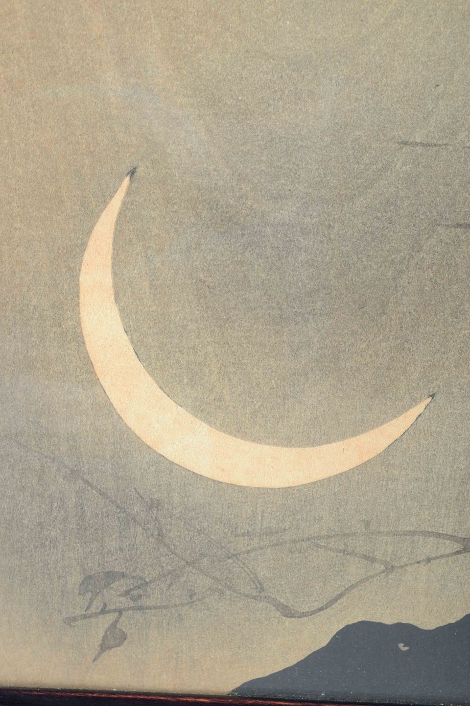 Et stemningsfuldt værk af Ohara Koson, kendt som en af de førende japanske kunstnere inden for shin-hanga-traditionen. Han er især berømt for sine fugle- og blomstermotiver, hvor naturens detaljer kombineres med en poetisk atmosfære. I dette maleri skildres en ugle, der sidder på en gren under en seglformet måne – et klassisk motiv hos Koson, hvor nattens ro og visdommens symbolik mødes i en raffineret komposition.