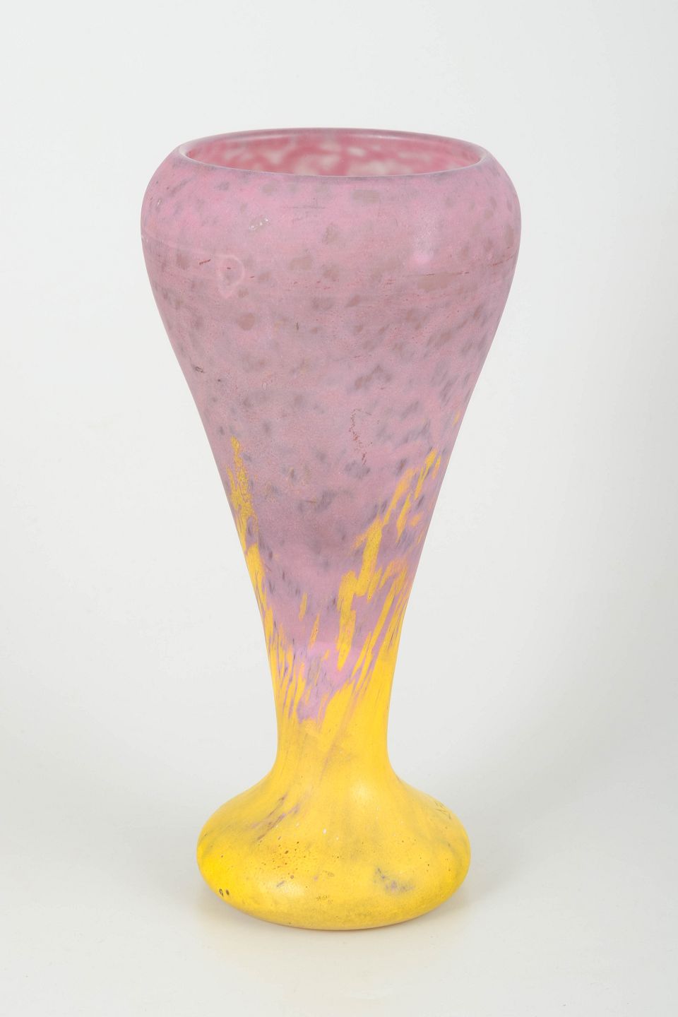 Organisk formet glasvase i matteret glas med flerfarvet dekoration i lilla og gule nuancer. Indgraveret signatur ”Daum Nancy” ved foden.