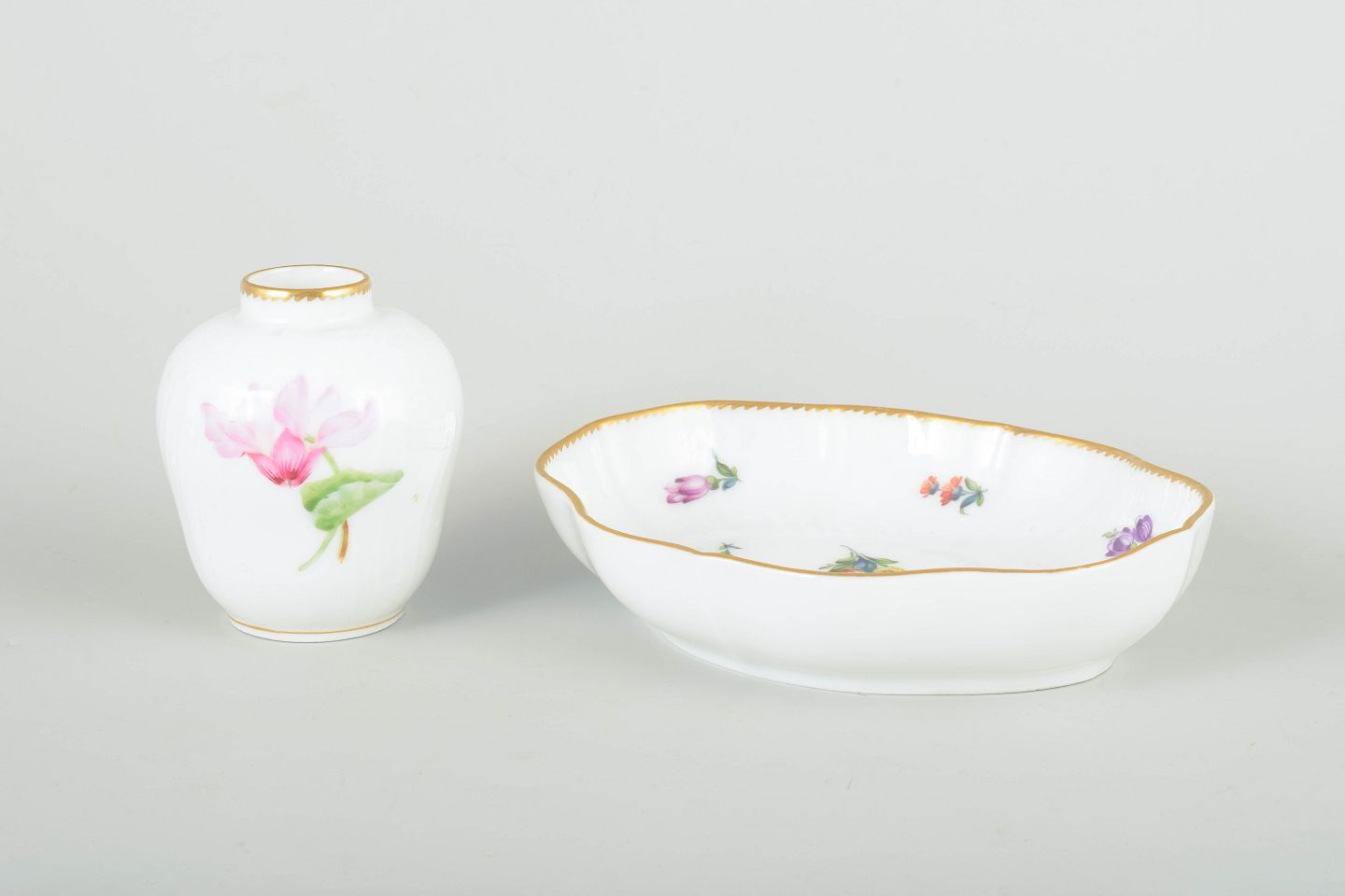 Porcelænssæt bestående af en lille balusterformet vase med håndmalet blomsterdekoration og guldkant samt et ovalt kagefad dekoreret i det klassiske “Sachsisk Blomst” mønster.