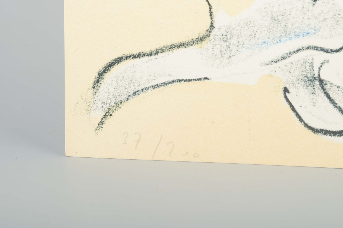 En organisk og abstrakt komposition udført i en fri og skitsepræget streg med blå og sorte toner på lys baggrund. Udtrykket er spontant og legende og typisk for den internationale grafiske kunst fra 1960’erne og 70’erne.