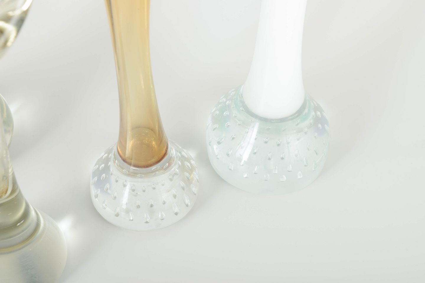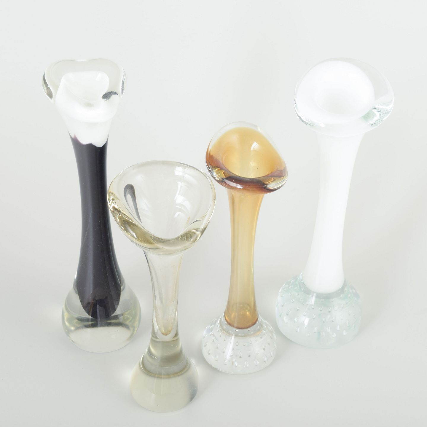 Serie af fire mundblæste glasvaser i klare og opaline nuancer af hvid, rav, røgfarvet og sort. Elegant organisk form med bred, blød kant og afrundet fod. Én vase signeret i bunden “Flygsfors 55”.