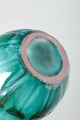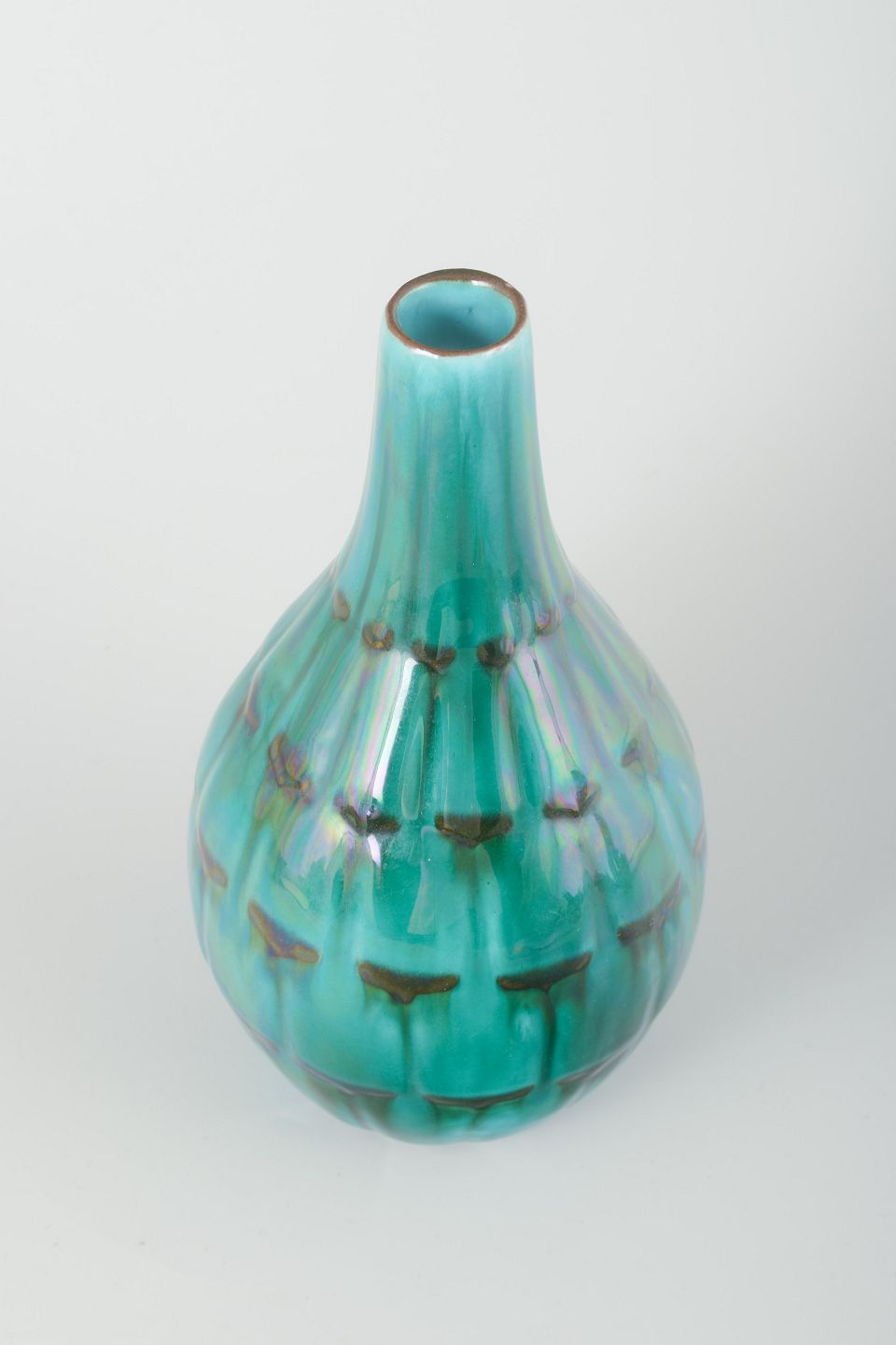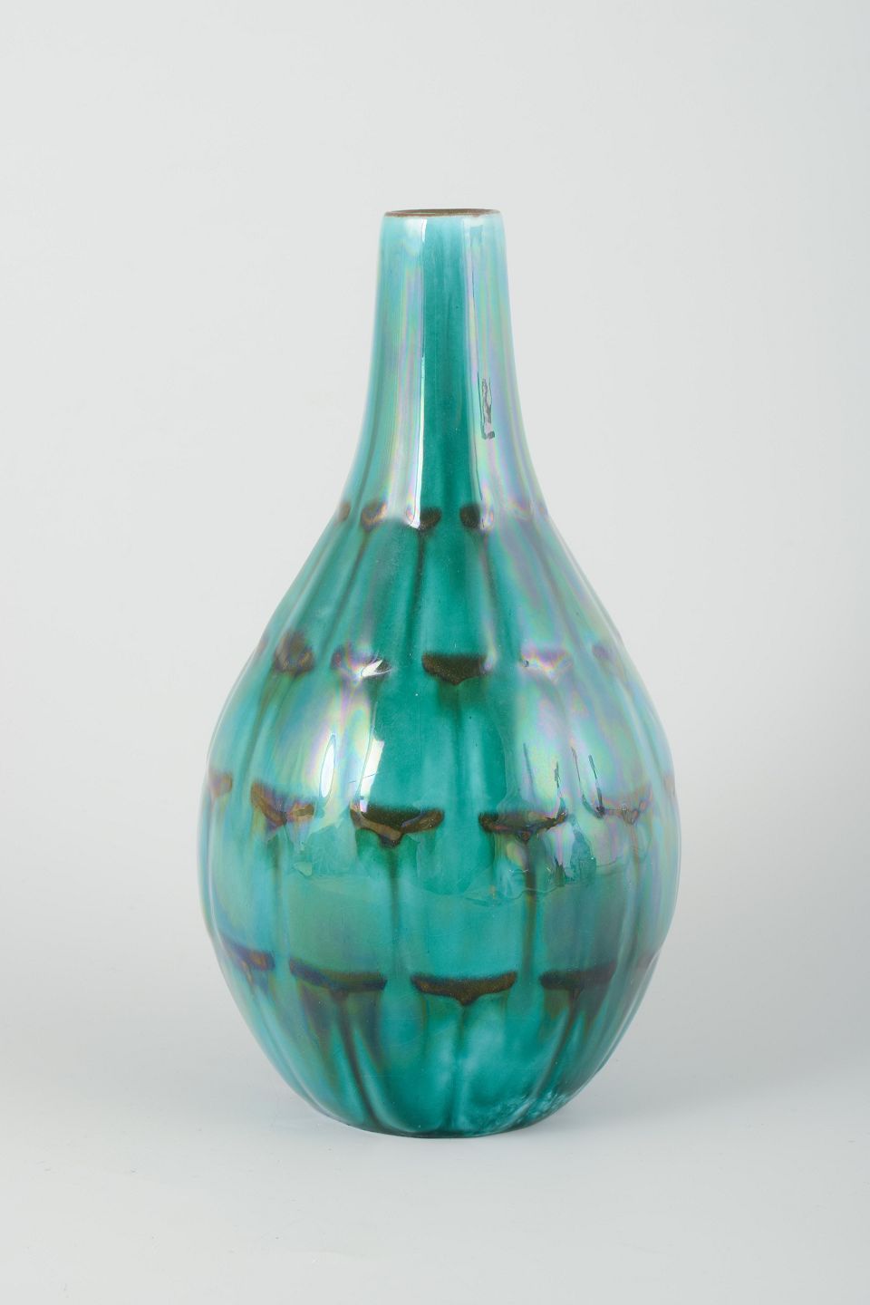 Teardrop-shaped vase in stoneware with glossy turquoise glaze and decorative vertical strokes in brownish tones.