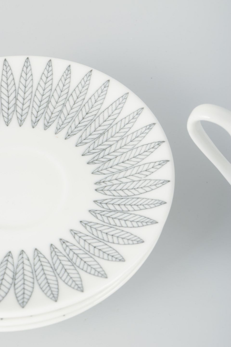 Fajance med det karakteristiske “Salix”-mønster i grå på hvid bund, designet af Stig Lindberg.