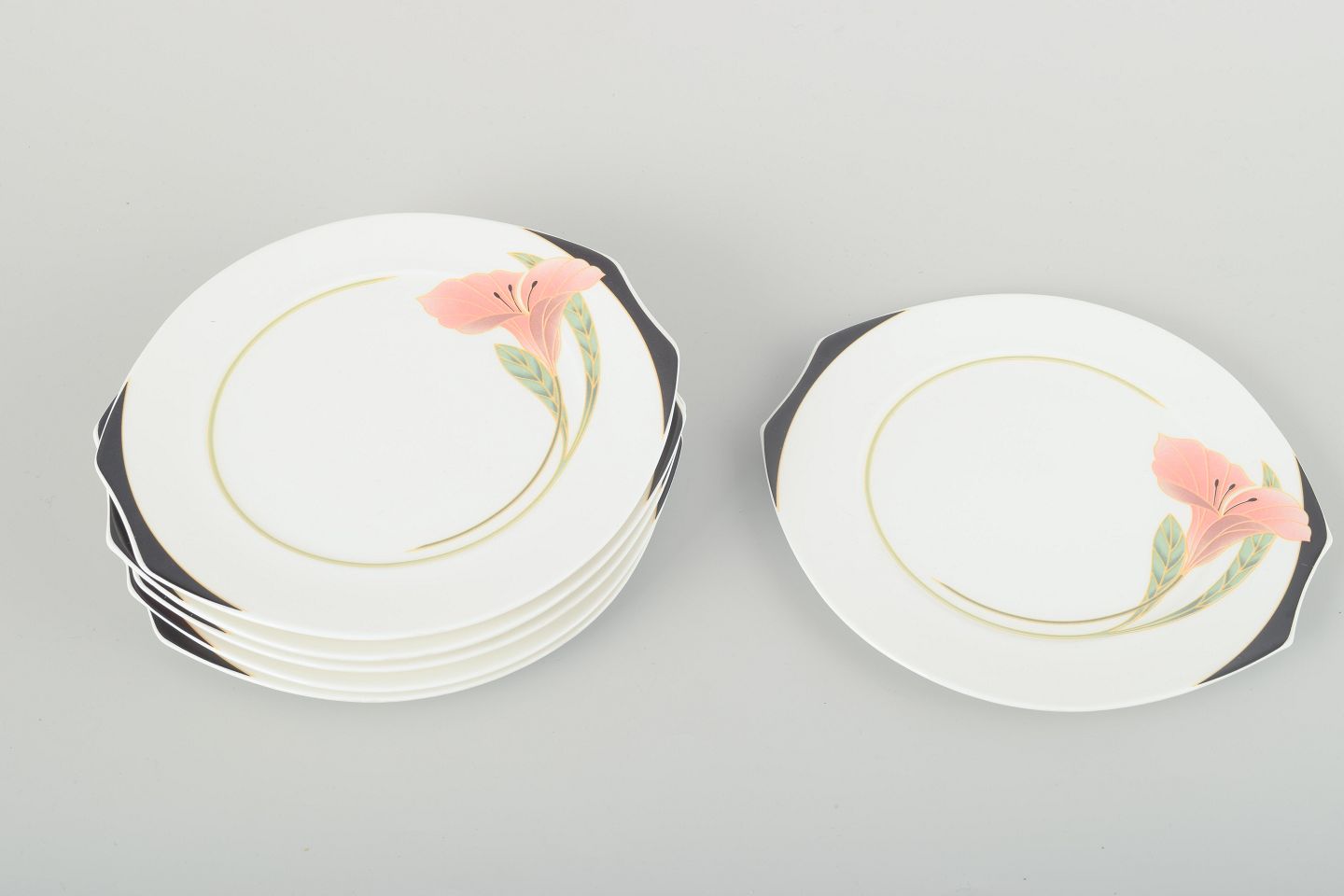 Seks porcelænstallerkener med håndmalet blomsterdekoration i rosa, grønne og sorte nuancer. Serien kombinerer bløde linjer og let asymmetriske detaljer med et elegant postmodernistisk formsprog.