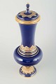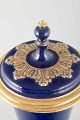 Elegant porcelænsvase med låg i dyb koboltblå glasur, rigt dekoreret med forgyldte akantus- og båndmotiver. Klassisk form med profileret fod og svungen hals, udført i Meissens karakteristiske kvalitet.