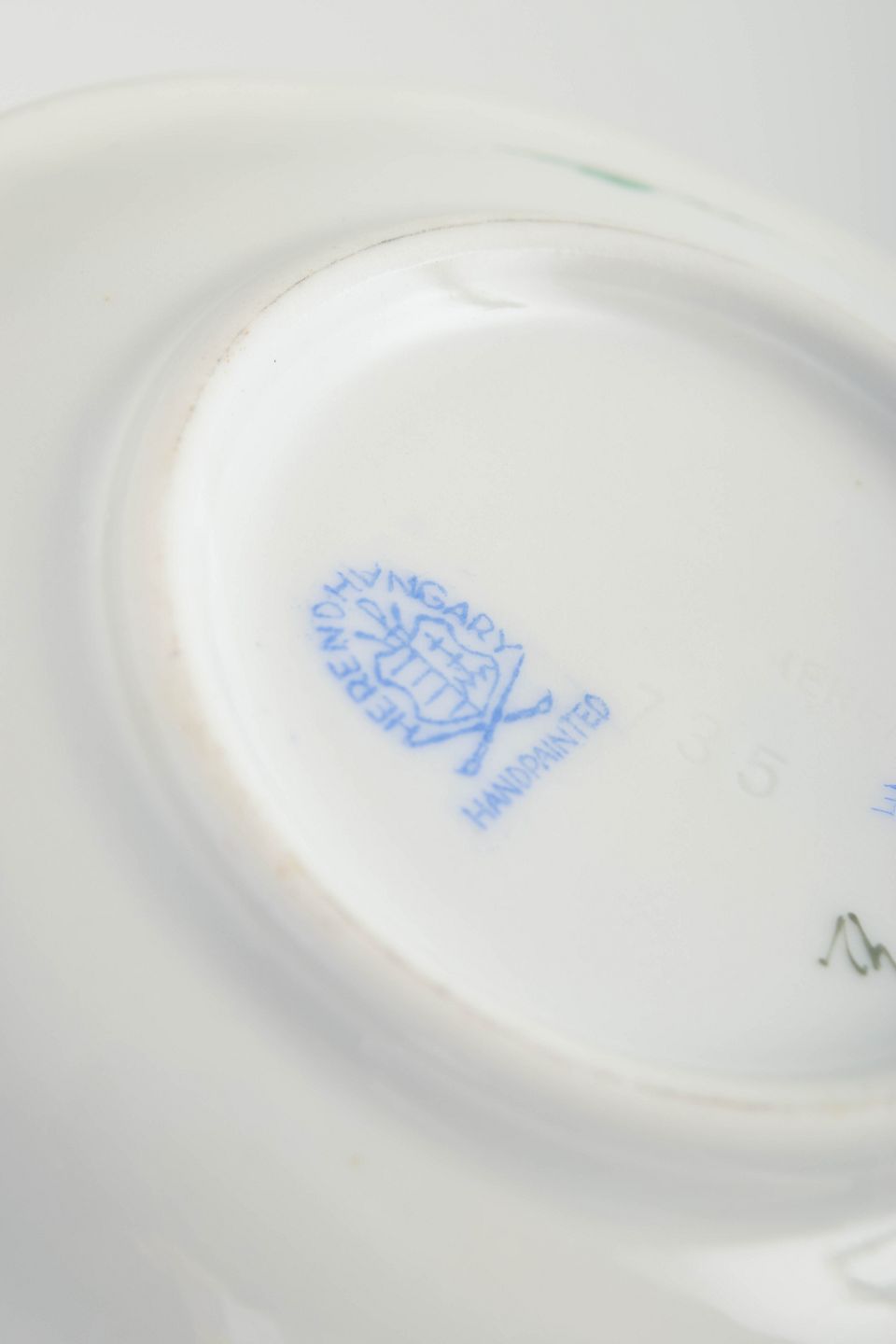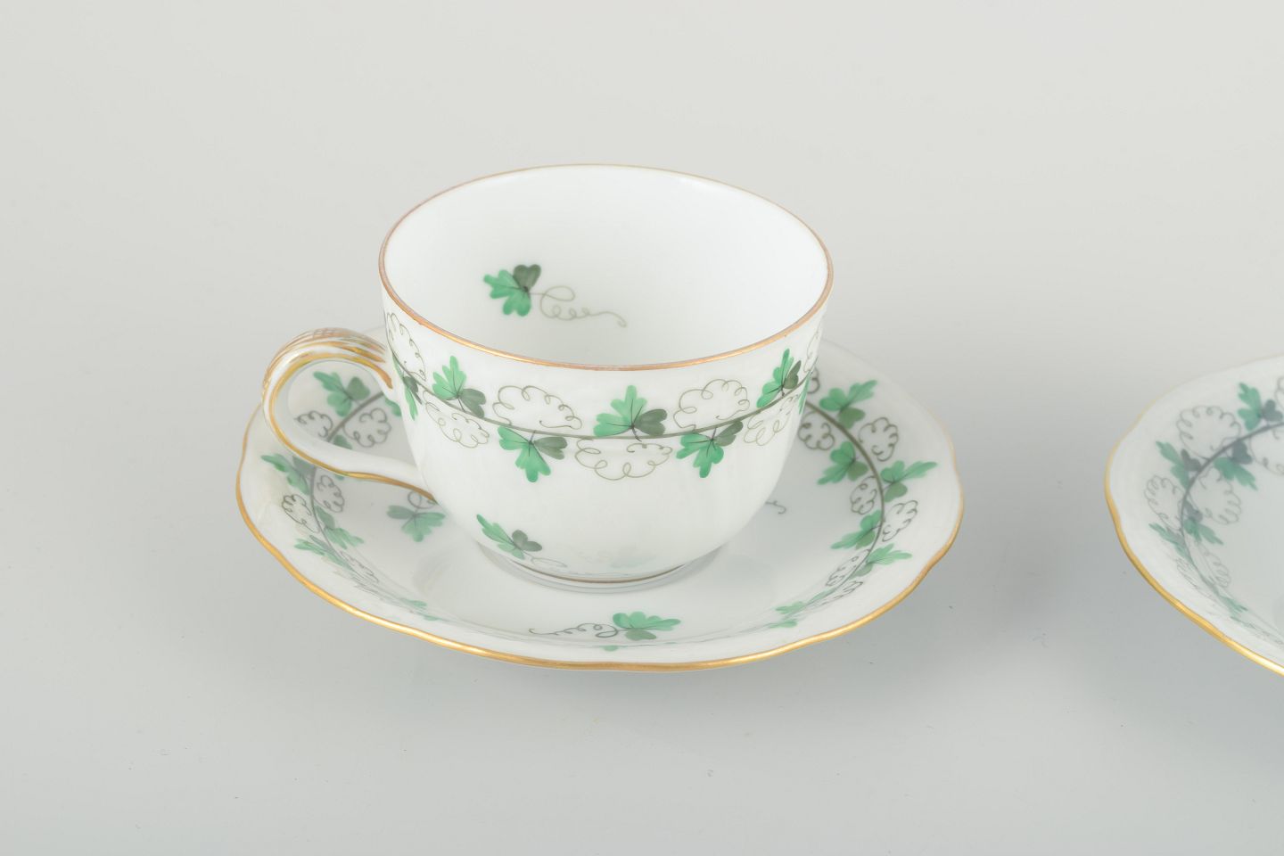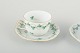 Elegant porcelænsservice med håndmalet grøn blomsterranke og forgyldte kanter. Klassisk Herend-dekoration med fine detaljer og let buet form.