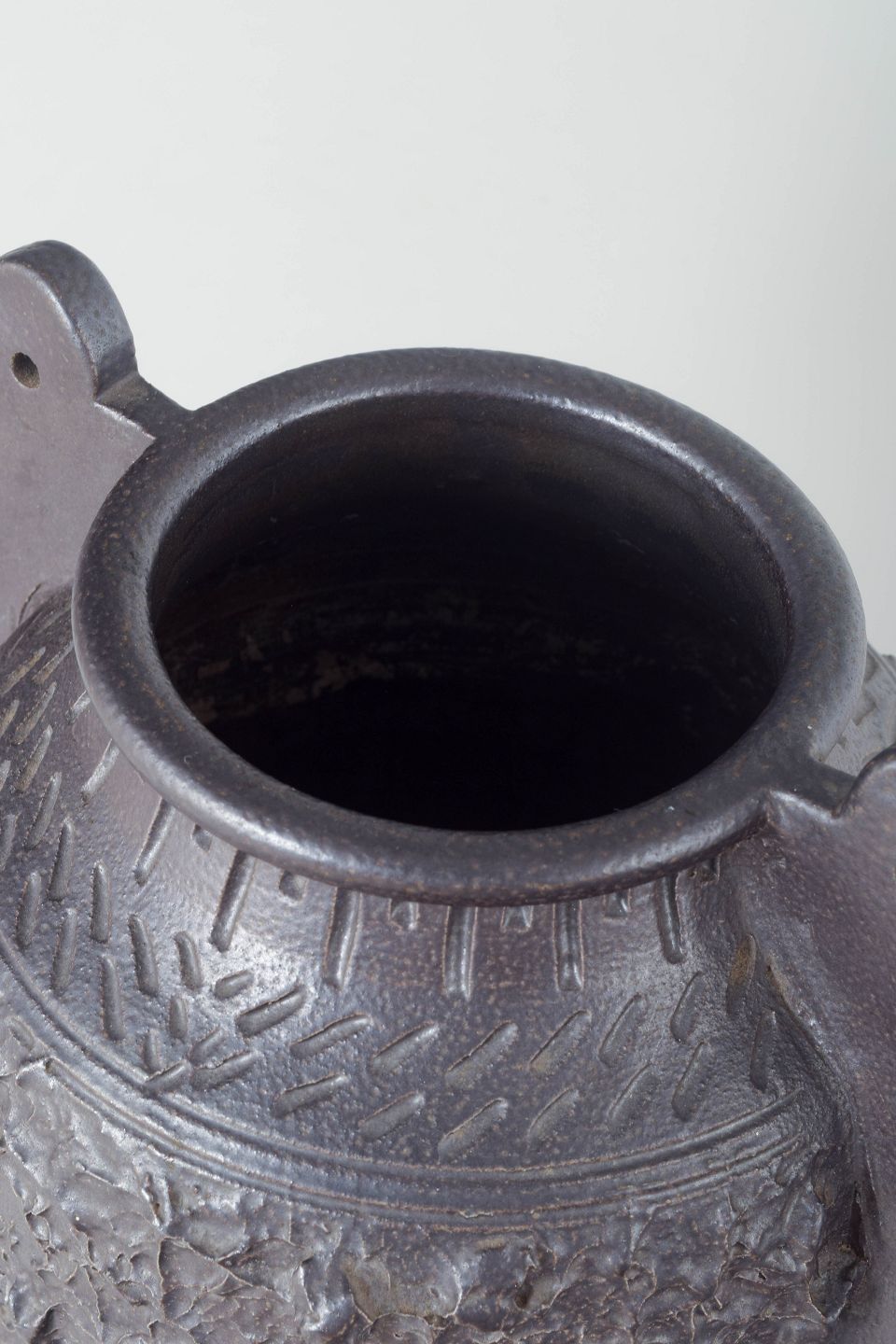 Art nouveau inspireret vase i terracotta med markant tekstureret overflade og formede hanke. Glasur i mørk, metallisk brun nuance, typisk for tidlige arbejder fra Höganäs Keramik.