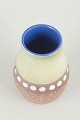 Dekorativ stentøjsvase i organisk form med mat, brun strukturoverflade på den nederste del, bånd med hvide cirkulære felter samt blankt glasurforløb i lysegrønne nuancer. Indvendigt udsmykket med dyb koboltblå glasur, som skaber en elegant kontrast.