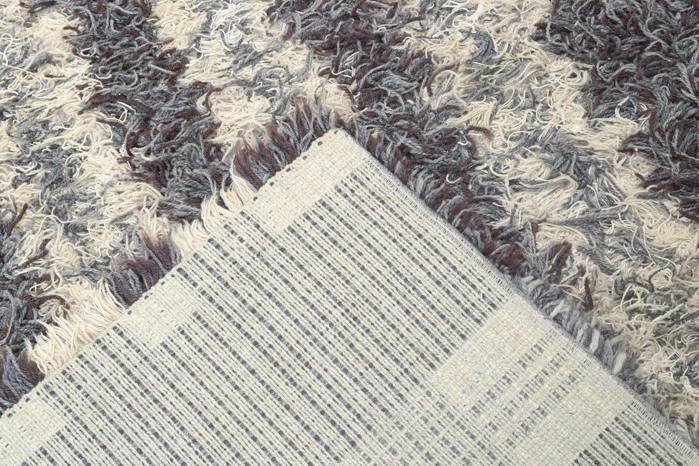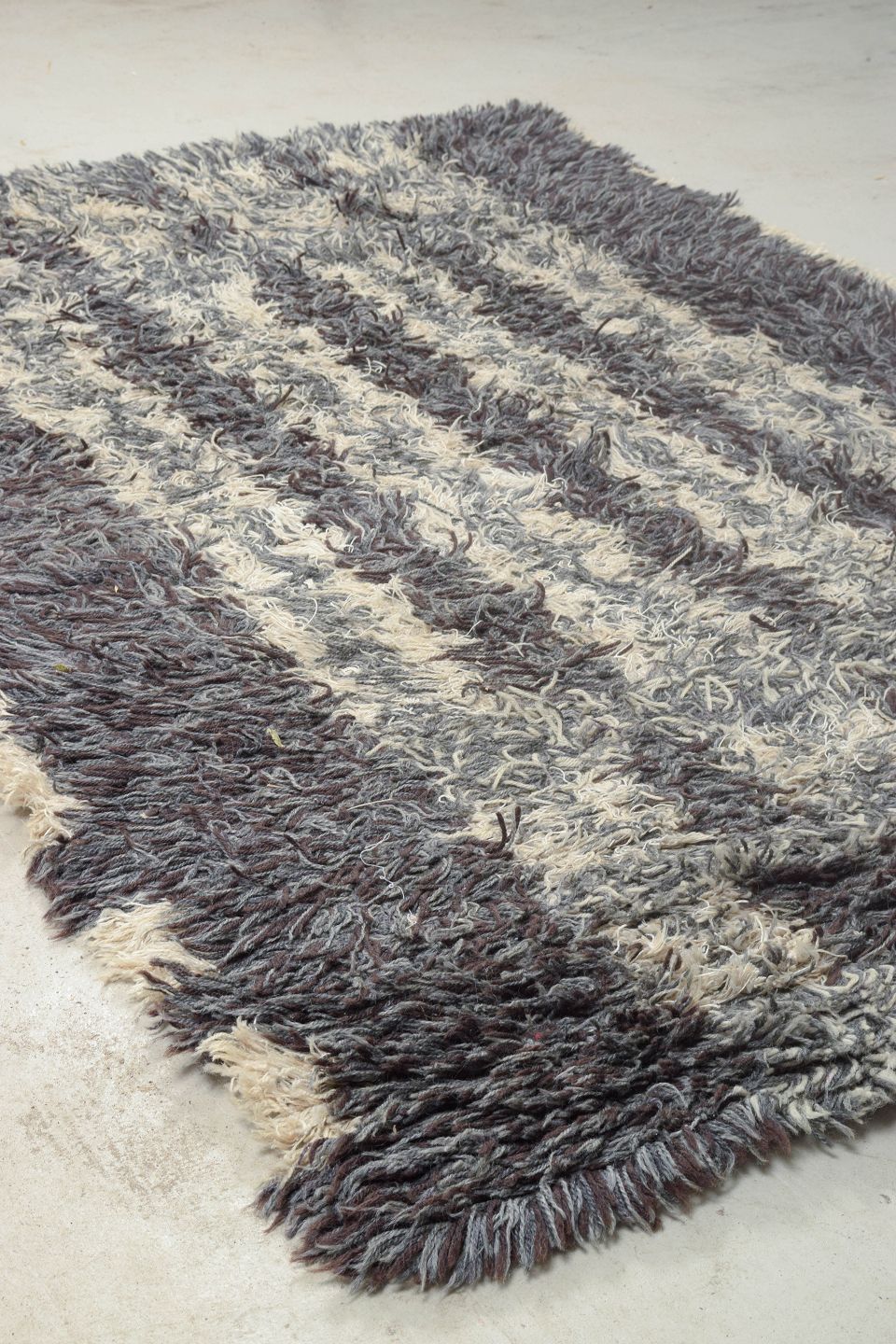 Håndknyttet rya-tæppe i uld med geometrisk mønster i grå og cremefarvede nuancer. Et klassisk eksempel på skandinavisk design fra perioden, hvor enkelhed og struktur blev kombineret med funktionel æstetik.