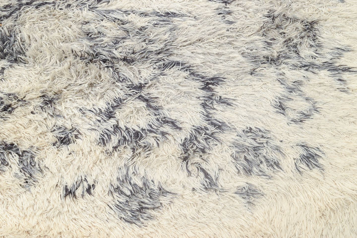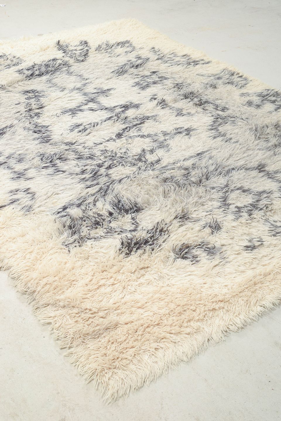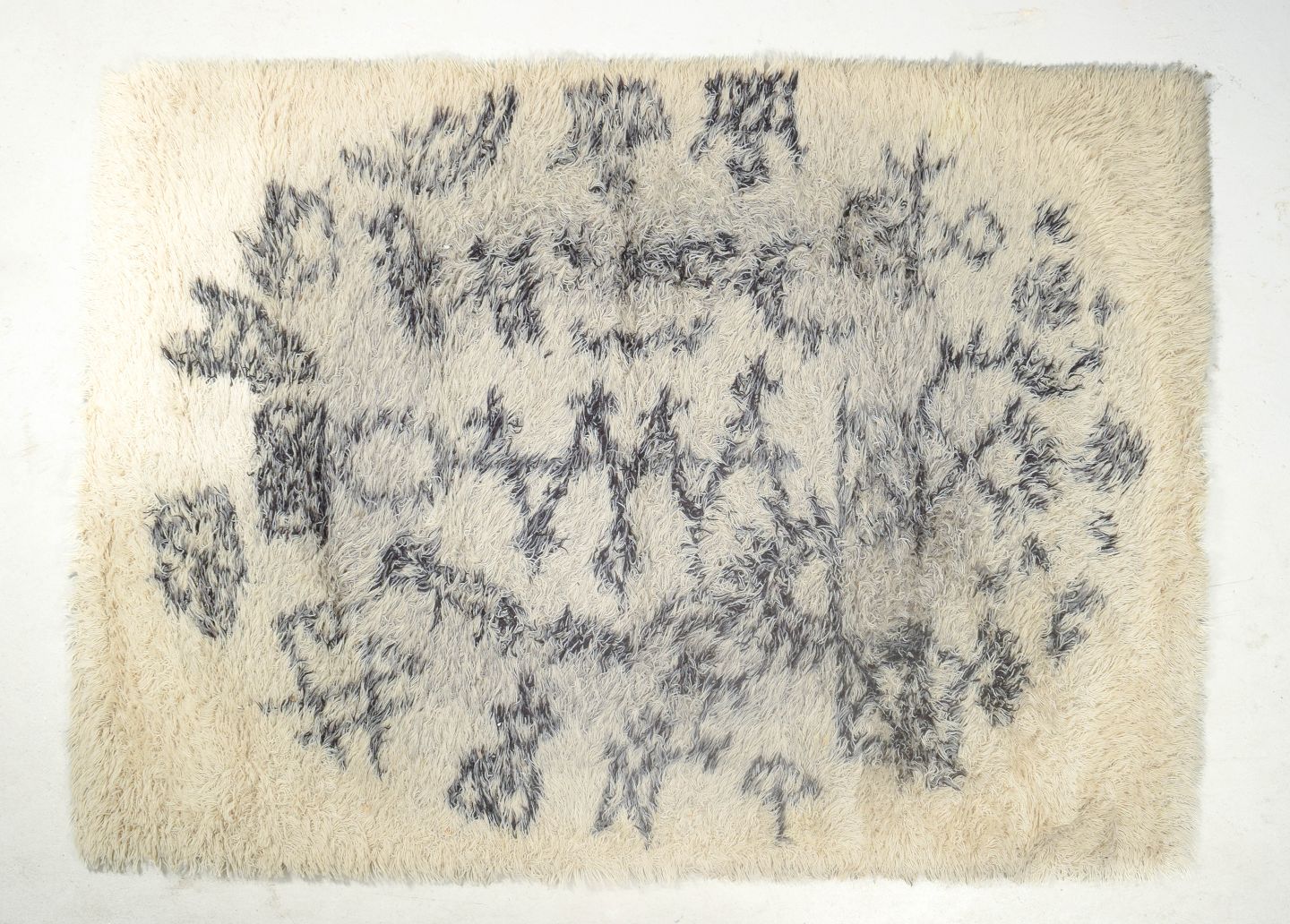 Stort håndknyttet rya-tæppe i uld med abstrakt mønster i sort og grå på lys bund. Designet “Vikingstad” af Clara Salander, et typisk eksempel på svensk tekstilkunst fra perioden, hvor håndværk, struktur og moderne formsprog blev forenet i dekorative indretningsobjekter.