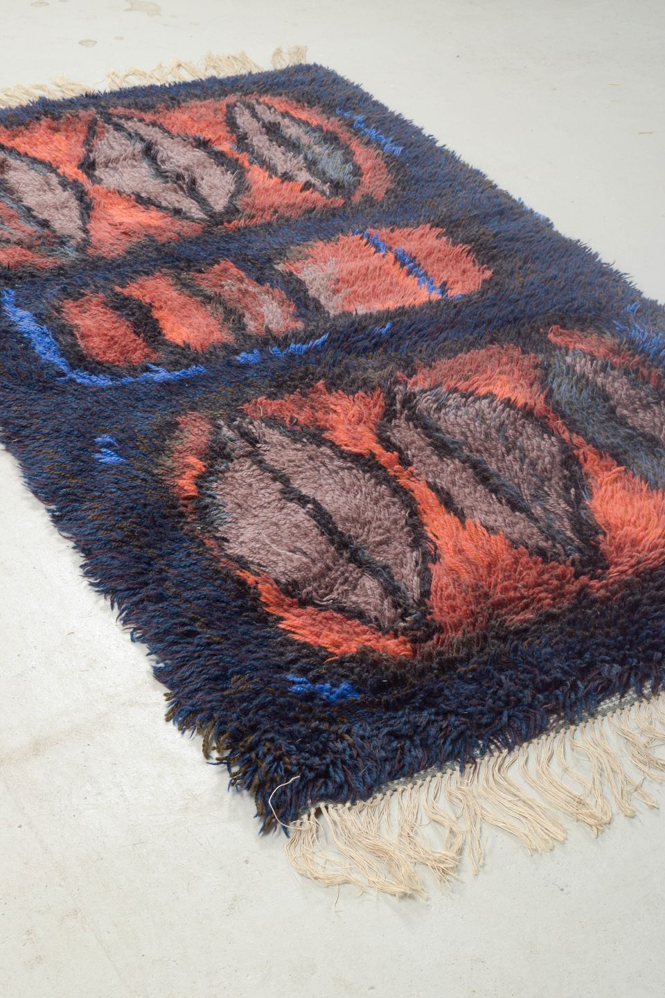 Håndknyttet rya-tæppe i ren uld med geometrisk, næsten skulpturelt mønster i varme røde, sorte og blå toner. Designet af Evy Viola Wiklund i 1967, et karakteristisk eksempel på svensk tekstilkunst fra perioden, hvor farvekontraster og organiske former var centrale elementer.