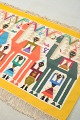 Håndvævet rölakan-vægtæppe i uld med et farverigt, figurativt motiv i stærke toner af gul, blå, rød, grøn og lilla på sennepsgul bund. Et karakteristisk eksempel på 1970’ernes svenske vævekunst, hvor traditionel rölakan-teknik blev brugt i dekorative og kunstneriske kompositioner.