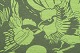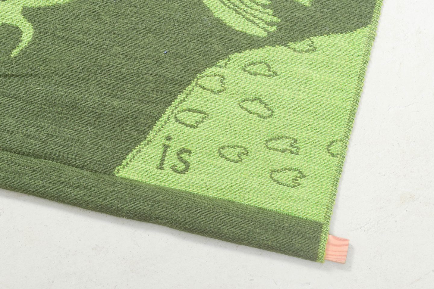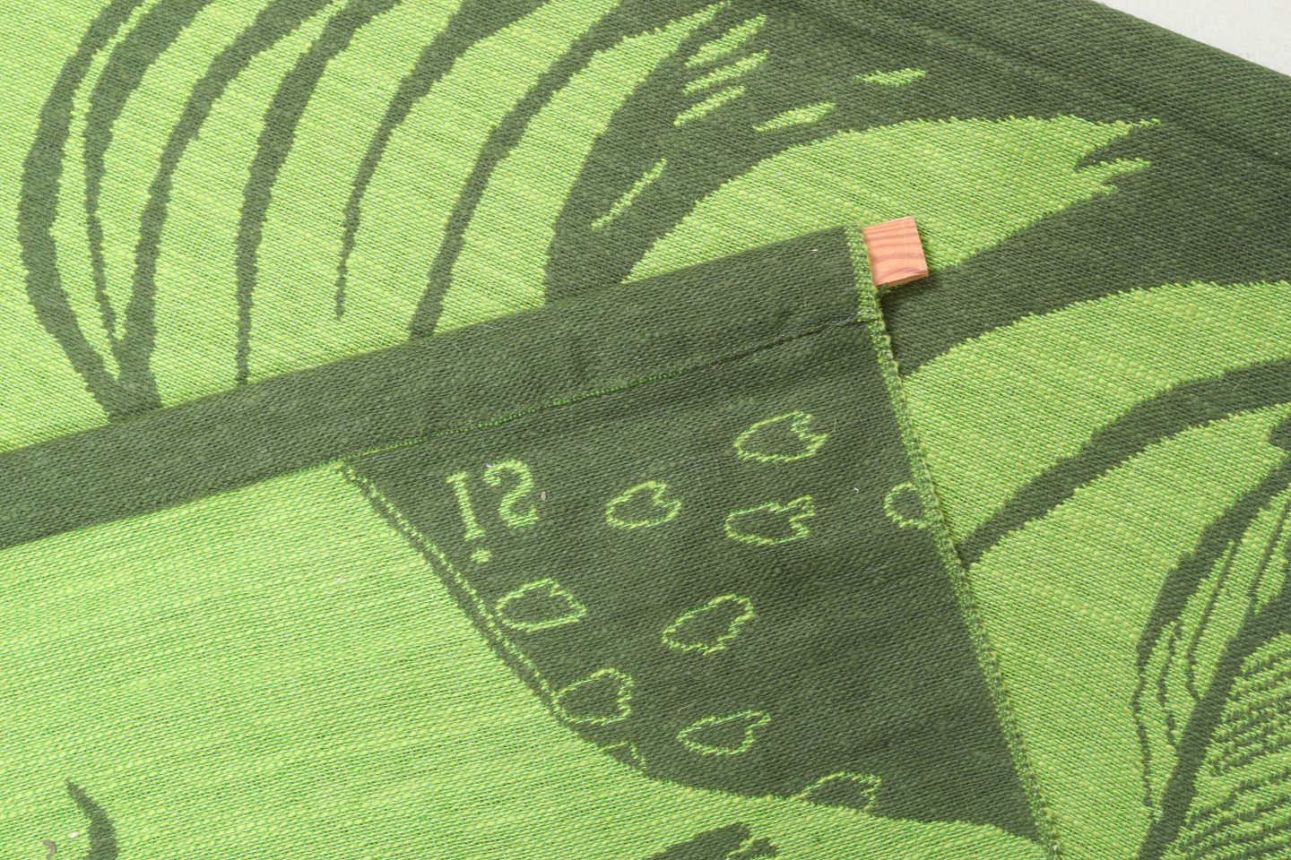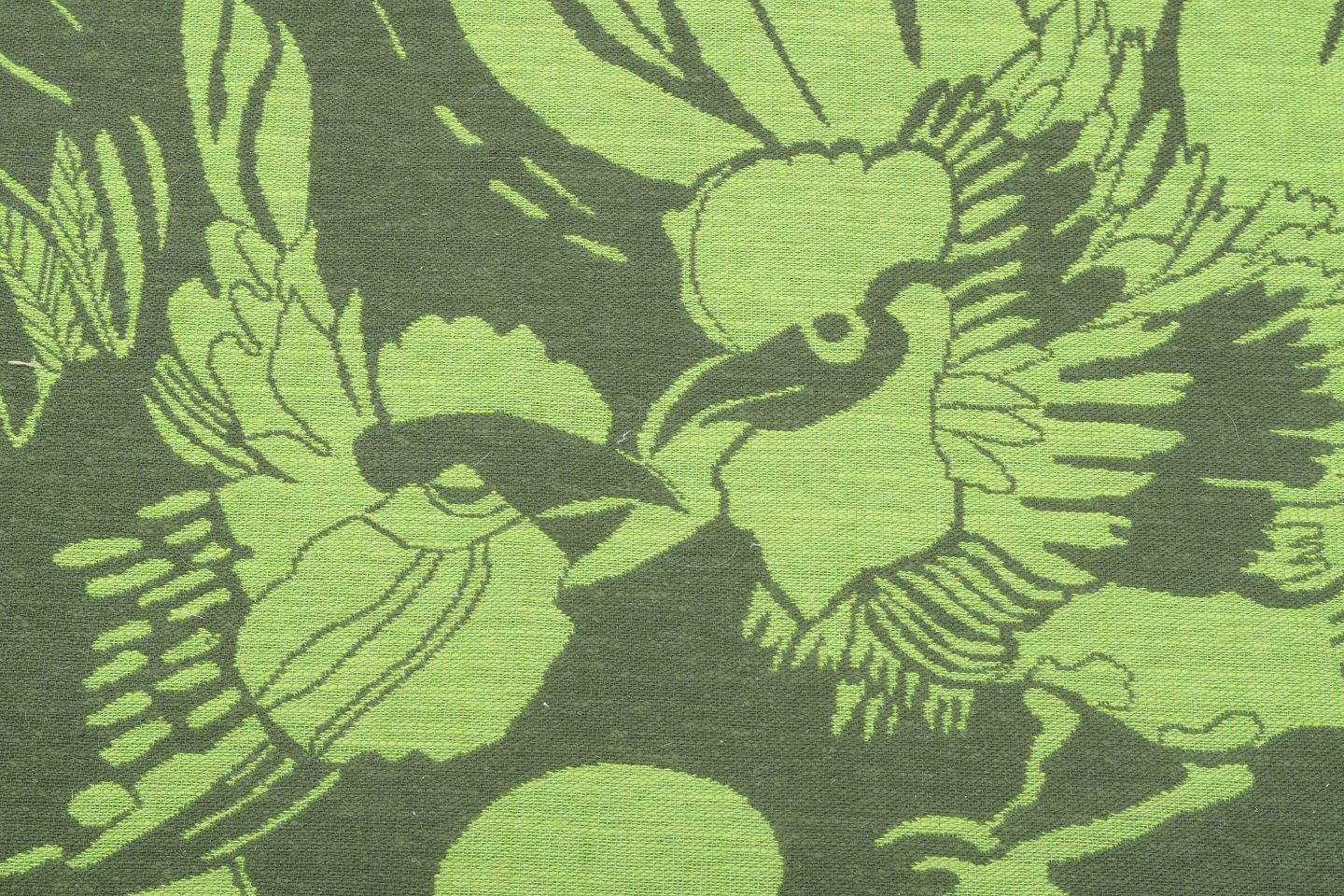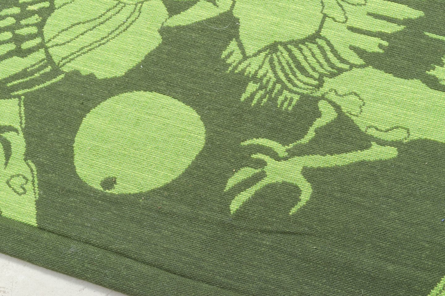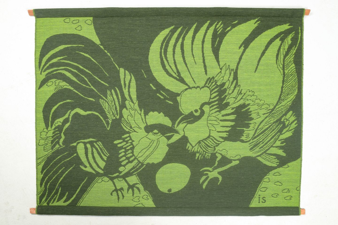 Håndvævet svensk vægtekstiltæppe i ren bomuld med motiv af to haner i bevægelse i grønne nuancer. Signeret “IS” i vævningen. Et dekorativt og karakteristisk arbejde af tekstilkunstneren Ingegerd Silow.