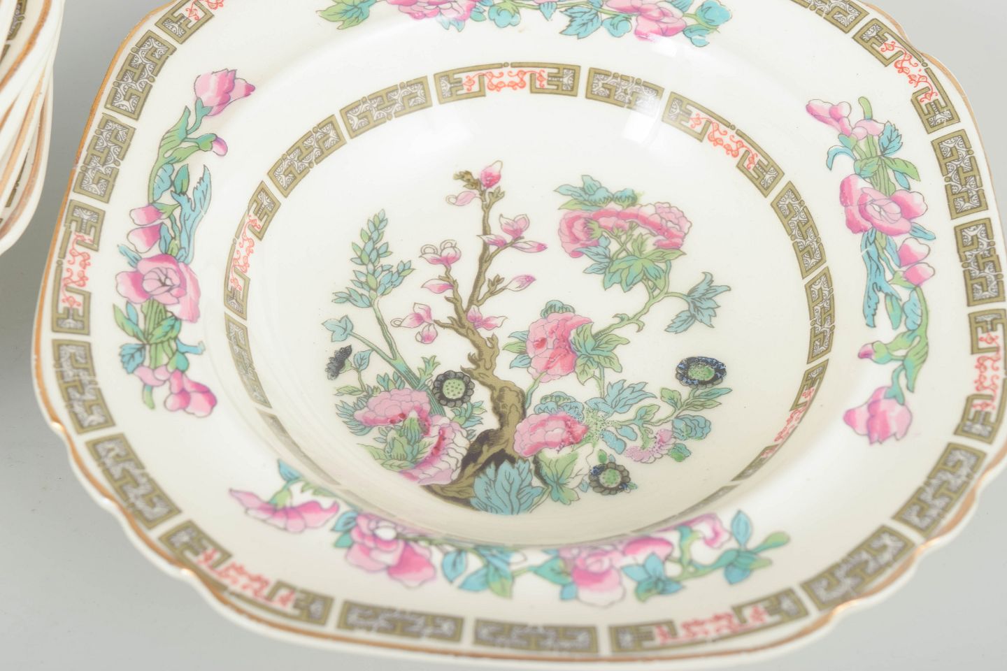 Fajance dybe tallerkener med dekorativt orientalsk motiv i flerfarvet transfer, typisk for engelske produktioner inspireret af kinesisk porcelæn.
