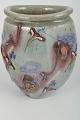 Unik vase i kinesisk-inspireret stil med dekorativ relief- og penselmalet dekoration samt lys celadonlignende glasur med farvede detaljer. Signeret.